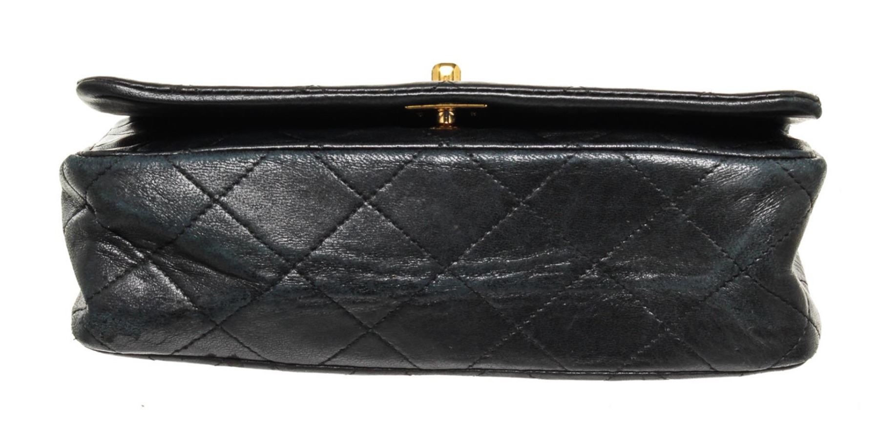 One Chanel Black Leather Mini Full Flap Shoulder Bag. Item is sold AS-IS. All available information is listed in the description and shown in the photo. Chanel Black Leather Medium Full Flap Shoulder Bag with leather, gold-tone hardware, interior slip pocket, chain shoulder strap and snap closure. PLEASE NOTE: bay has been redyed, base of bag is creased.