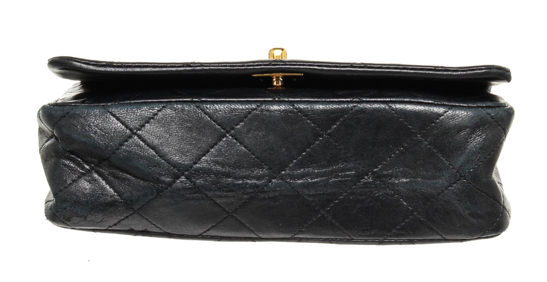 One Chanel Black Leather Mini Full Flap Shoulder Bag. Item is sold AS-IS. All available information is listed in the description and shown in the photo. Chanel Black Leather Medium Full Flap Shoulder Bag with leather, gold-tone hardware, interior slip pocket, chain shoulder strap and snap closure. PLEASE NOTE: bay has been redyed, base of bag is creased.