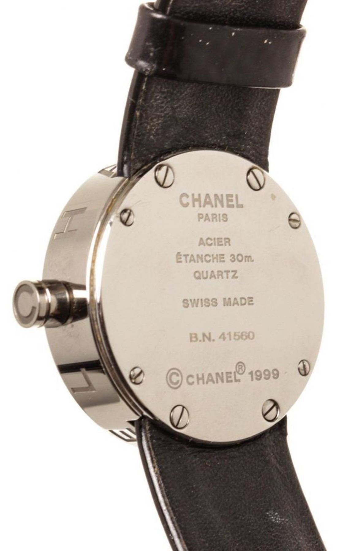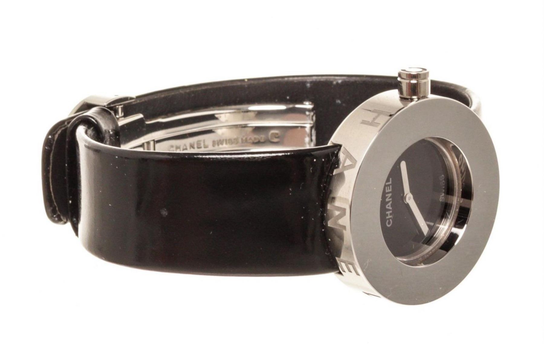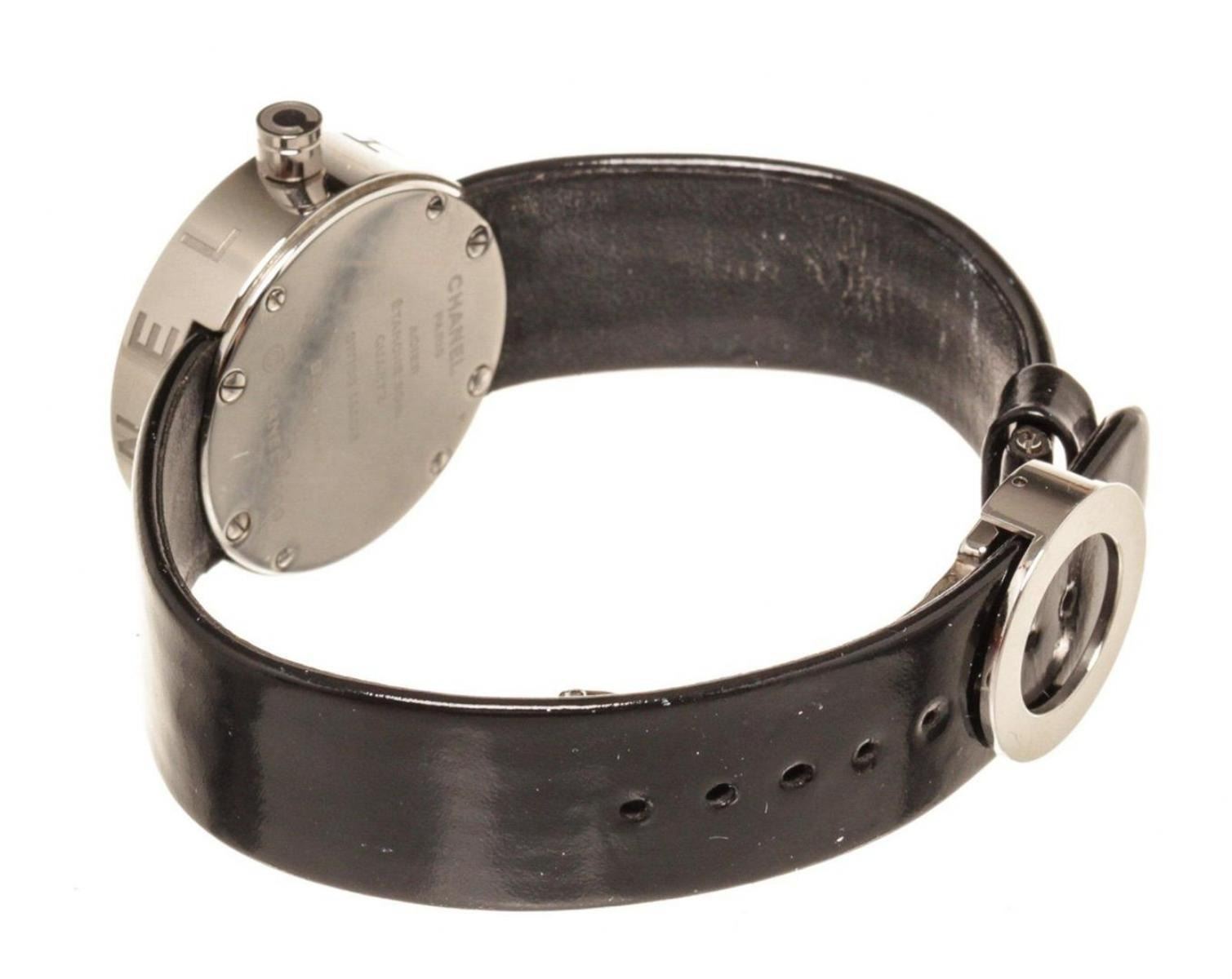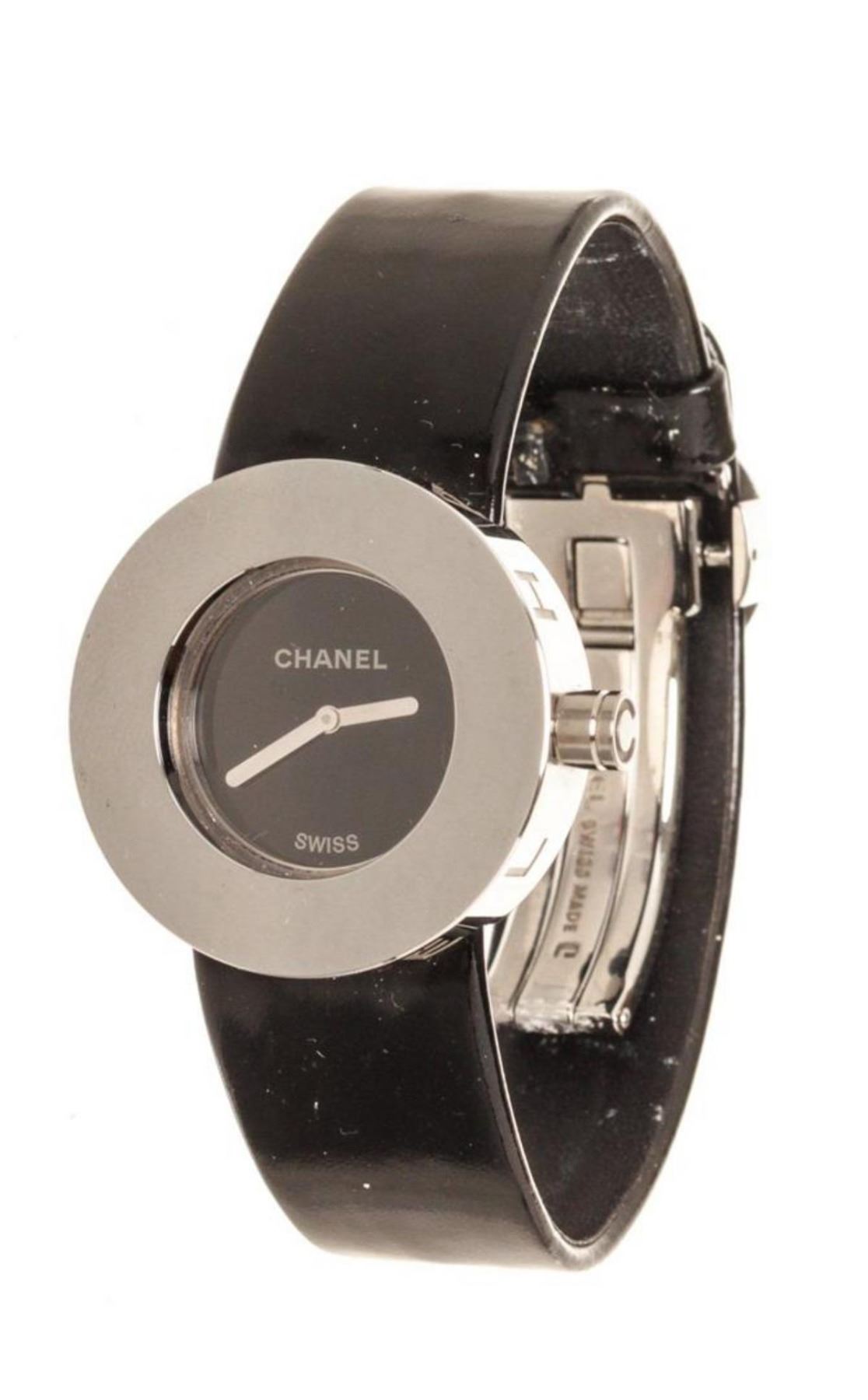 Chanel Black Leather Monte Ronde Watch with leather, gold-tone hardware and turn lock closure.