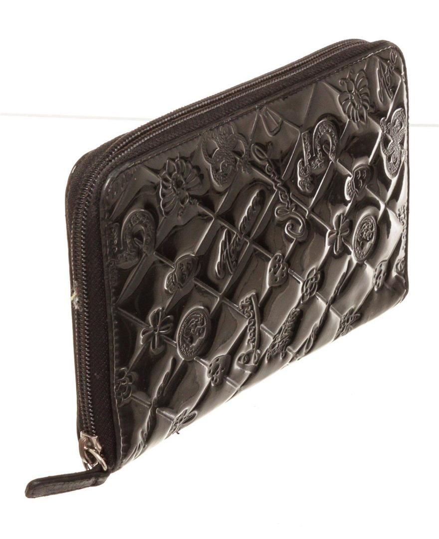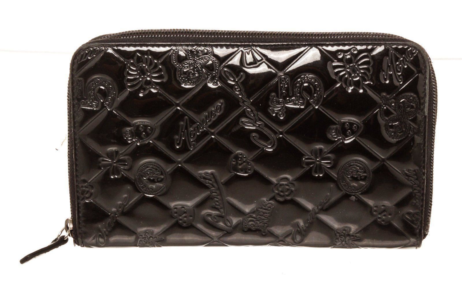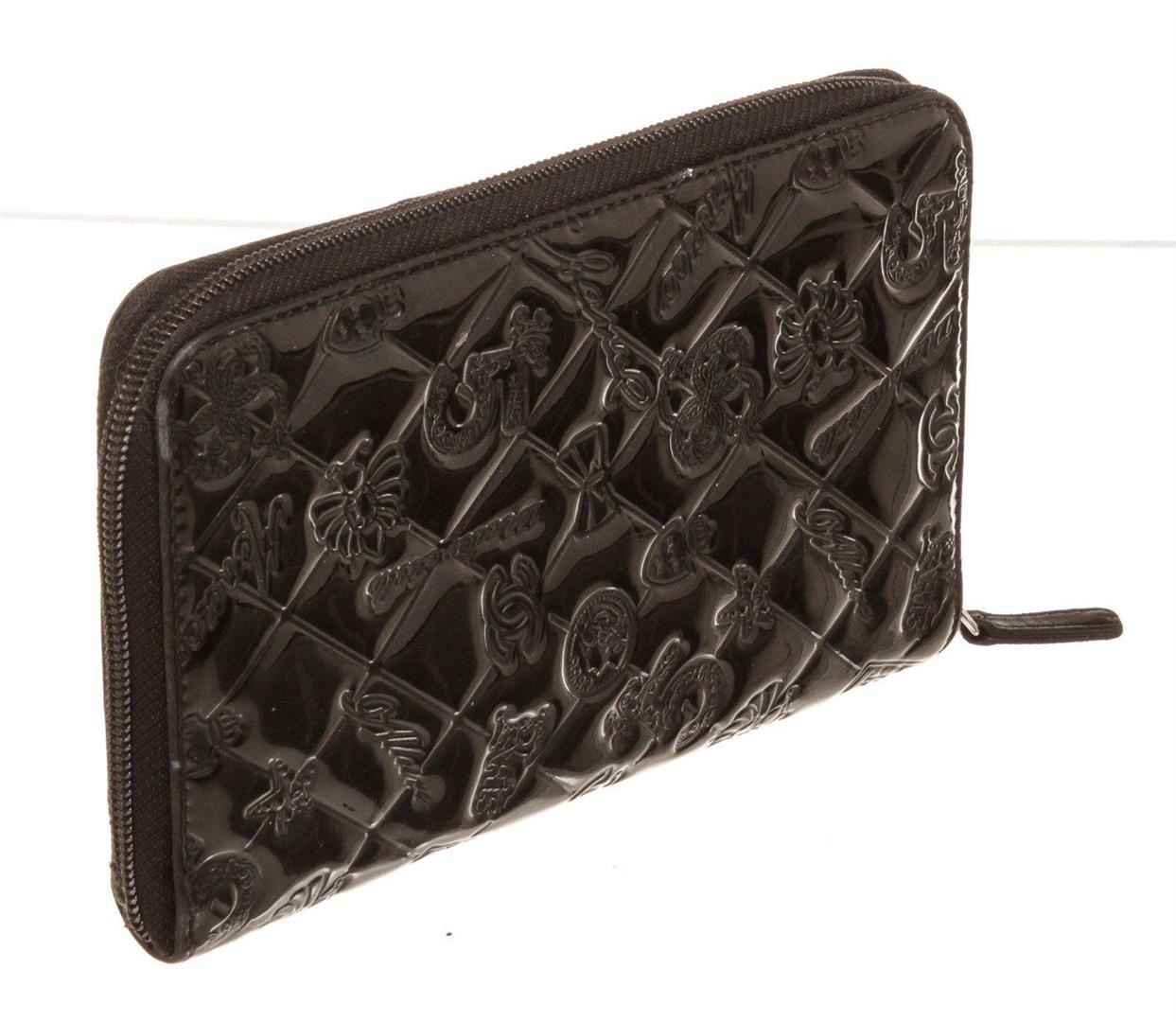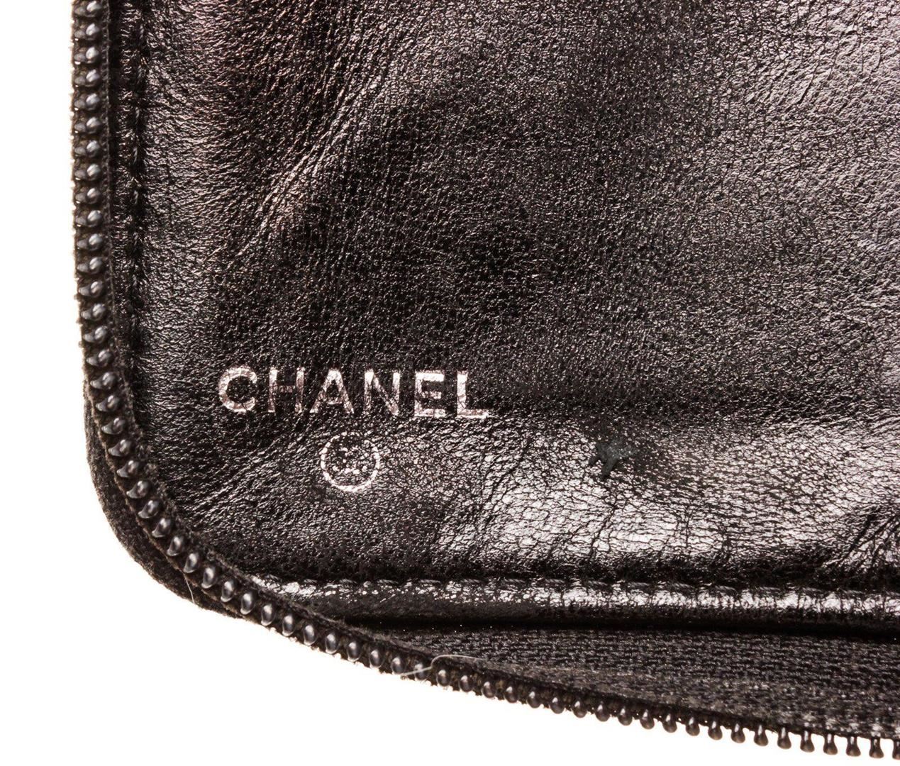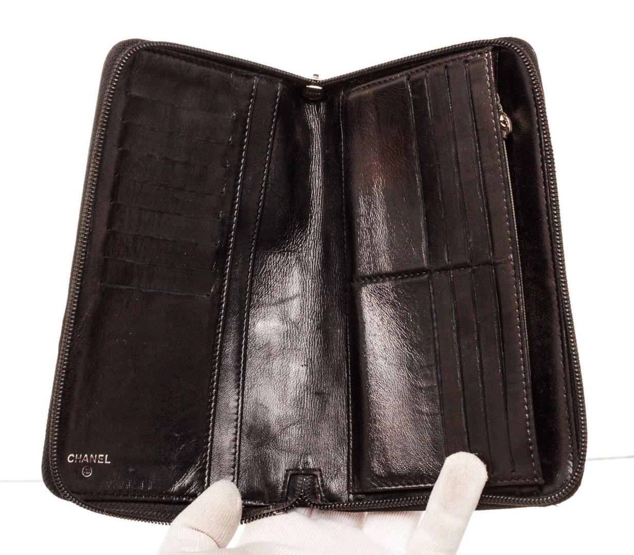 Chanel Black Leather Organizer Wallet with material leather, gold-tone hardware, trim leather, interior three compartments pockets and zipper closure.