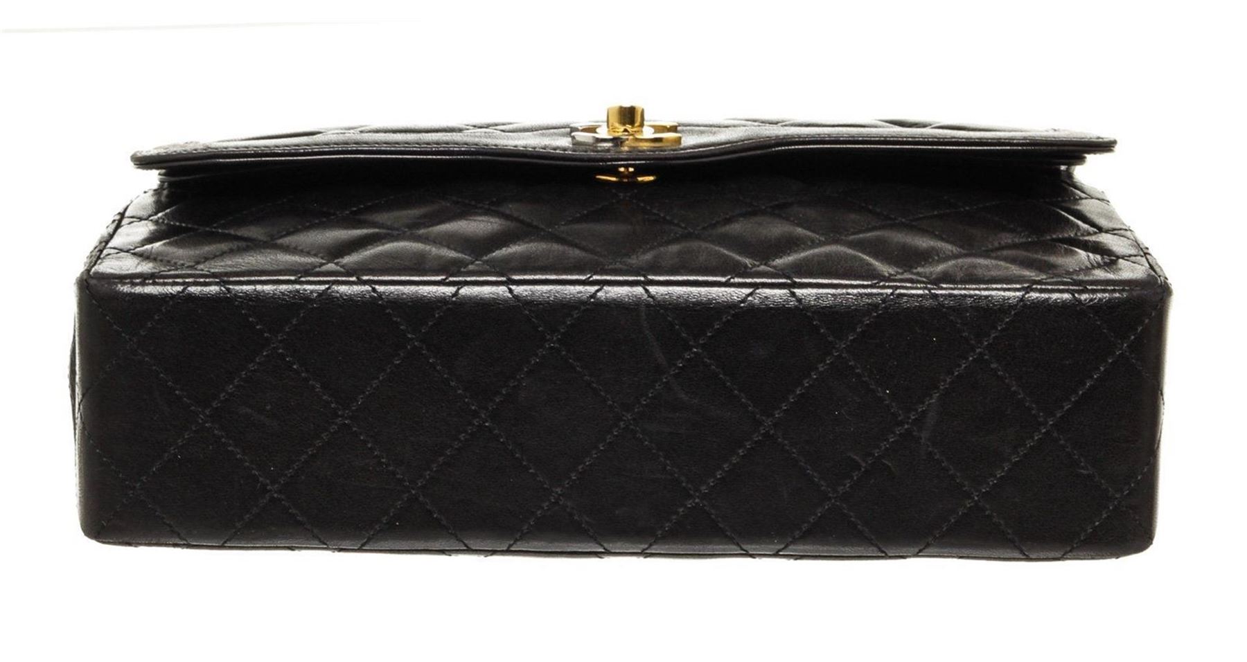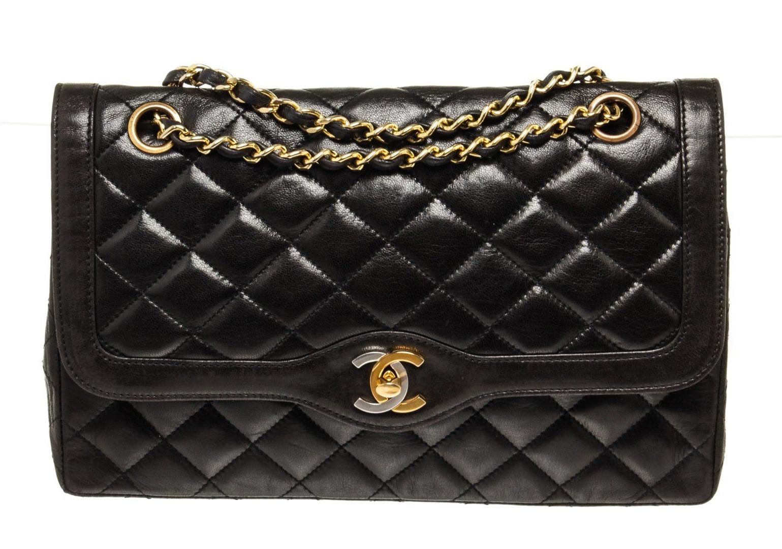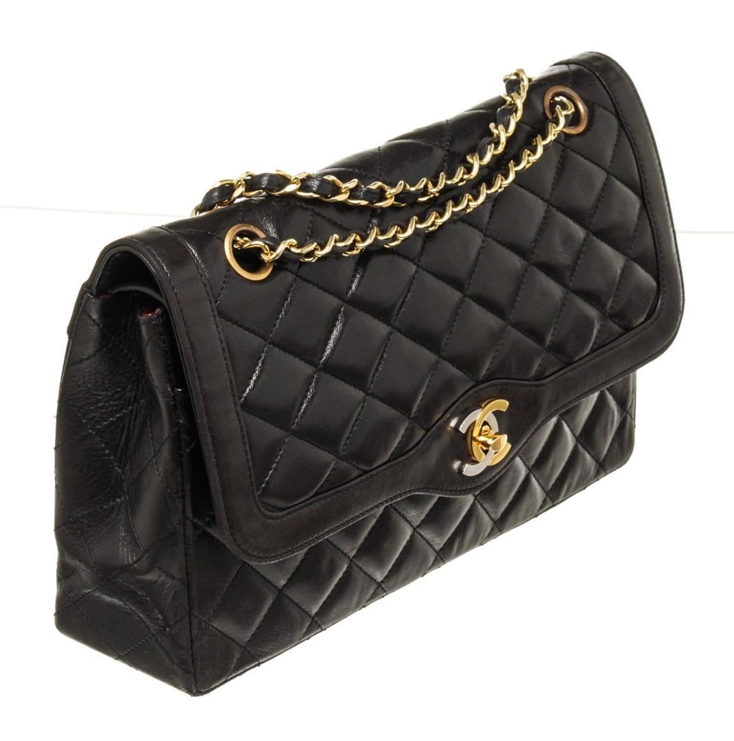 Chanel Black Leather Paris Chain Shoulder Bag with leather, gold-tone hardware, interior slip pocket, chain shoulder strap and snap closure. Measurements: 11 in / 28 cm 2.25 in / 6 cm 6.75 in / 17 cm Condition: Pre-Owned Good