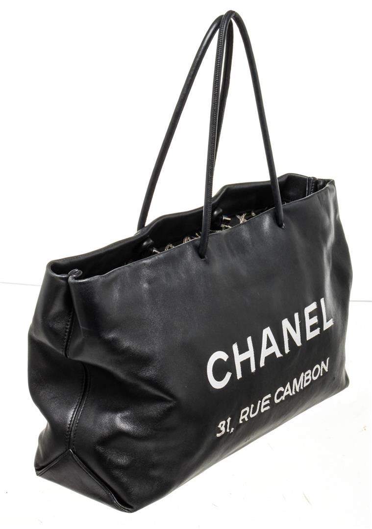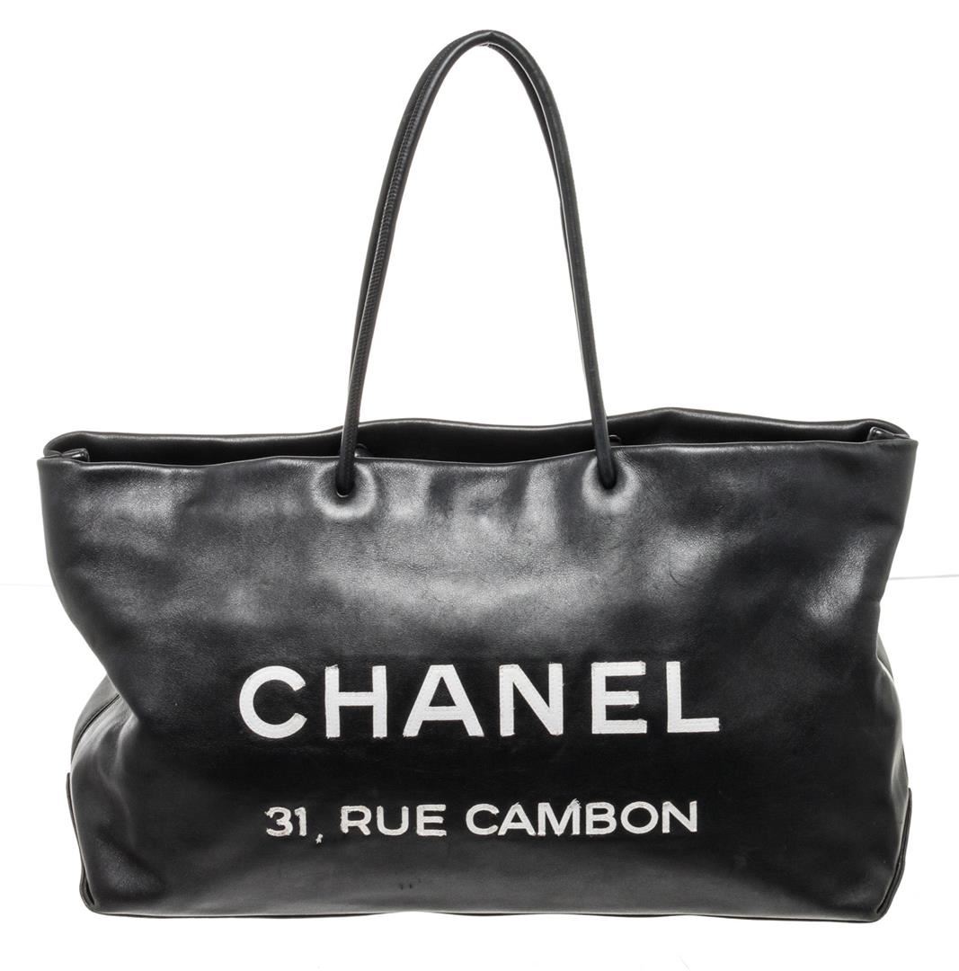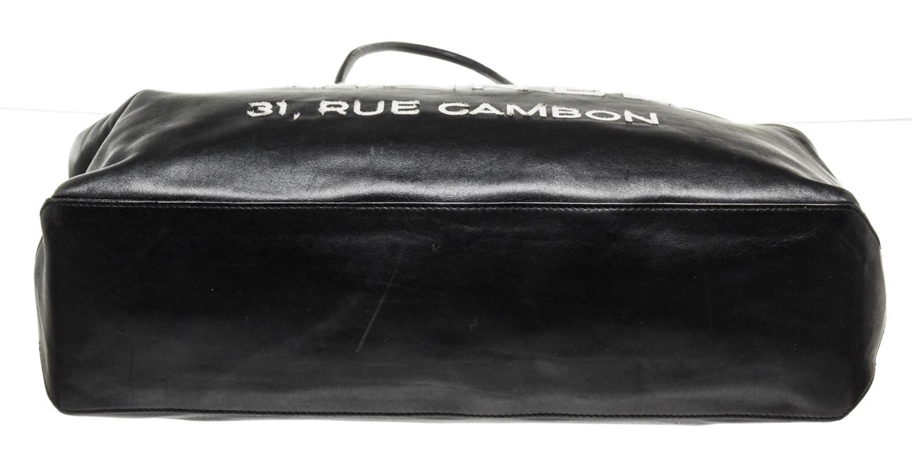 Chanel Black Leather Rue Cambon Tote Bag with leather, gold-tone hardware, interior slip pockets, shoulder strap and zipper closure.