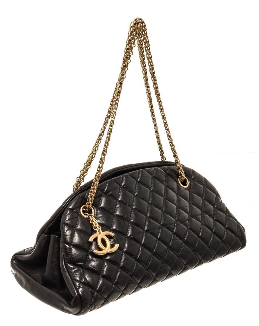 One Chanel Black Leather Small Just Mademoiselle Bowling Bag. Item is sold AS-IS. All available information is listed in the description and shown in the photo. Chanel black leather small Just Mademoiselle bowling bag with quilted black leather exterior, red fabric lining, gold-tone hardware, two top chain straps, a CC hardware logo, an open top, and three main compartments: a middle one with zipper, and two open ones. Height: 19.05 cm (7.5 in) Width: 13.97 cm (5.5 in)