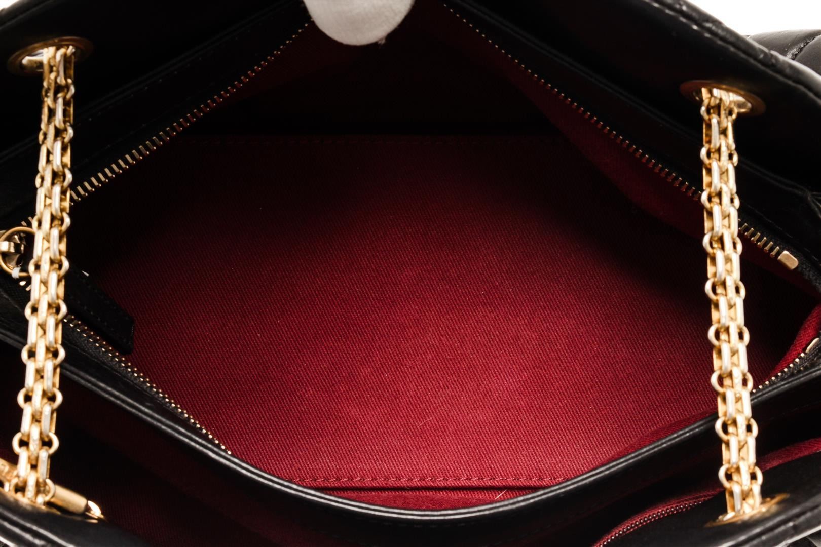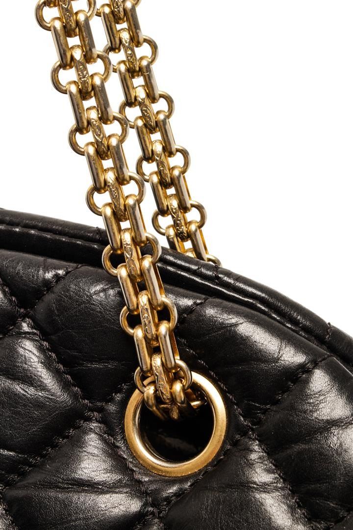 One Chanel Black Leather Small Just Mademoiselle Bowling Bag. Item is sold AS-IS. All available information is listed in the description and shown in the photo. Chanel black leather small Just Mademoiselle bowling bag with quilted black leather exterior, red fabric lining, gold-tone hardware, two top chain straps, a CC hardware logo, an open top, and three main compartments: a middle one with zipper, and two open ones. Height: 19.05 cm (7.5 in) Width: 13.97 cm (5.5 in)