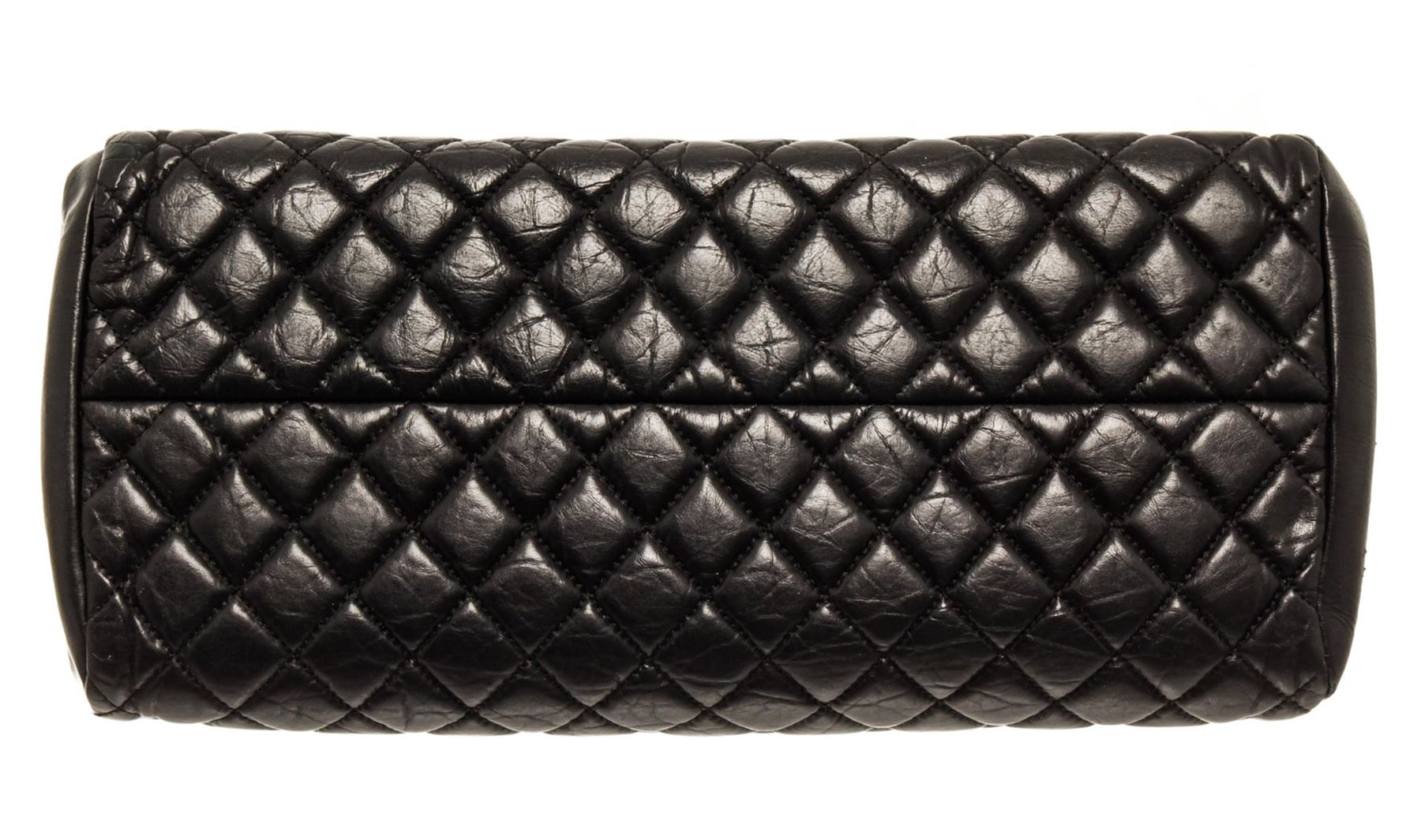 One Chanel Black Leather Small Just Mademoiselle Bowling Bag. Item is sold AS-IS. All available information is listed in the description and shown in the photo. Chanel black leather small Just Mademoiselle bowling bag with quilted black leather exterior, red fabric lining, gold-tone hardware, two top chain straps, a CC hardware logo, an open top, and three main compartments: a middle one with zipper, and two open ones. Height: 19.05 cm (7.5 in) Width: 13.97 cm (5.5 in)