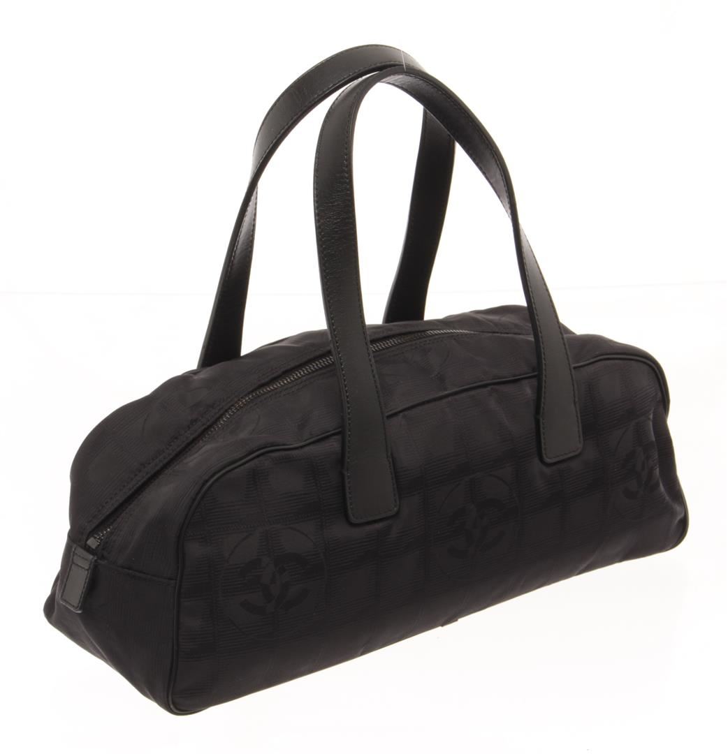 Chanel Black Nylon Mini Jacquard Travel Line Boston Bag. All available information is listed in the description and shown in the photos. Chanel mini boston bag inBlackbeige jacquard nylon from the travel linez, Outside has black leather handles, It is secured with a zipper closure and inside has a fabric lining with one zipper pocket. 13.8 x 4.3 x 5.1 inches/ 35 x 11 x 13 cm