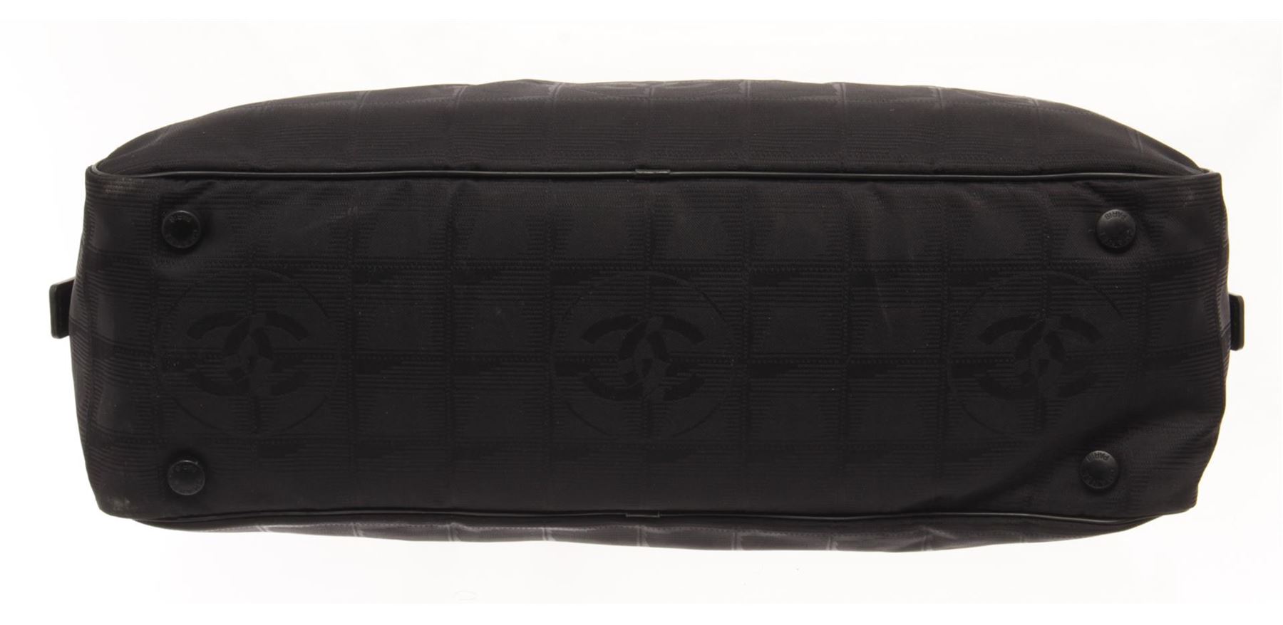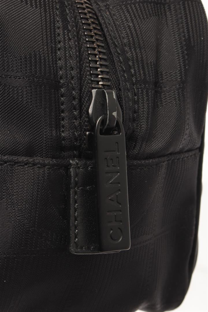 Chanel Black Nylon Mini Jacquard Travel Line Boston Bag. All available information is listed in the description and shown in the photos. Chanel mini boston bag inBlackbeige jacquard nylon from the travel linez, Outside has black leather handles, It is secured with a zipper closure and inside has a fabric lining with one zipper pocket. 13.8 x 4.3 x 5.1 inches/ 35 x 11 x 13 cm