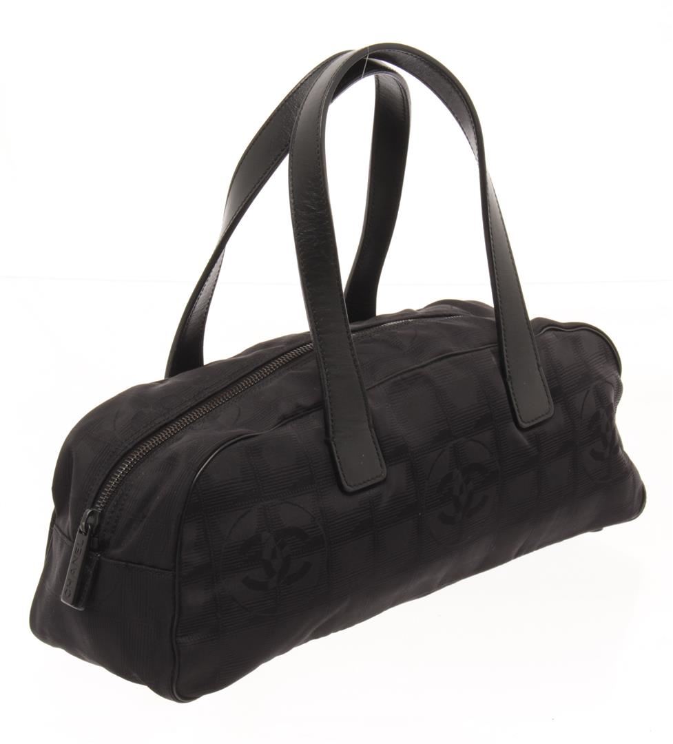 Chanel Black Nylon Mini Jacquard Travel Line Boston Bag. All available information is listed in the description and shown in the photos. Chanel mini boston bag inBlackbeige jacquard nylon from the travel linez, Outside has black leather handles, It is secured with a zipper closure and inside has a fabric lining with one zipper pocket. 13.8 x 4.3 x 5.1 inches/ 35 x 11 x 13 cm