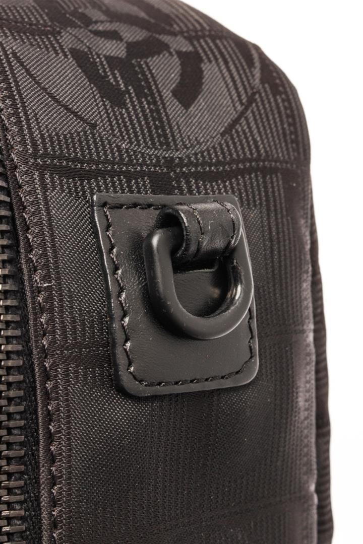 Chanel Black Nylon Travel Bag. All available information is listed in the description and shown in the photos. chanel black nylon travel bag with light wear and marks on exterior and in interior, scuffs on leather trism and handle, slight loss of shape on handle. pilling on zipper tapes, scratches and discoloration on hardware. Height 11.5", Width 14", Depth 5", Strap Drop 8.5-20" / 29.21 x 35.56 x 12.7 Cm