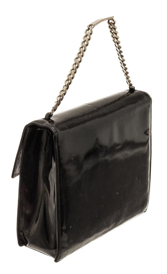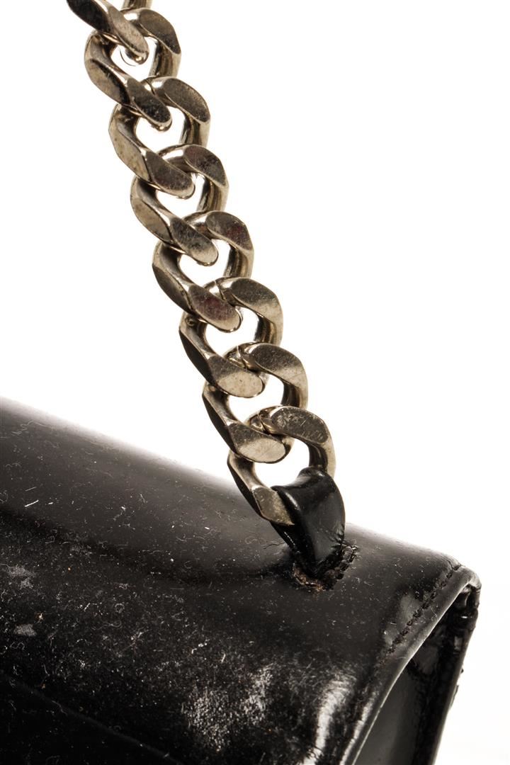 One Chanel Black Patent Leather CC Chain Shoulder Bag. Item is sold AS-IS. All available information is listed in the description and shown in the photo. Chanel black patent leather CC chain shoulder bag with black patent leather exterior, black leather lining, silver-toned hardware, silver chain top handle with shoulder pad, flap and snap button closure, CC logo on the flap, and one interior zip pocket. Conditions: this bag has a fine scratch at the base of the flap (photo), and on the back chain inlay (photo) no signs of wear or stains inside and out. chain length 34 cm. Height: 9.1" Width: 10.6" Depth: 3.1", Handle Drop: / 23.11 x 26.92 x 7.87 Cm