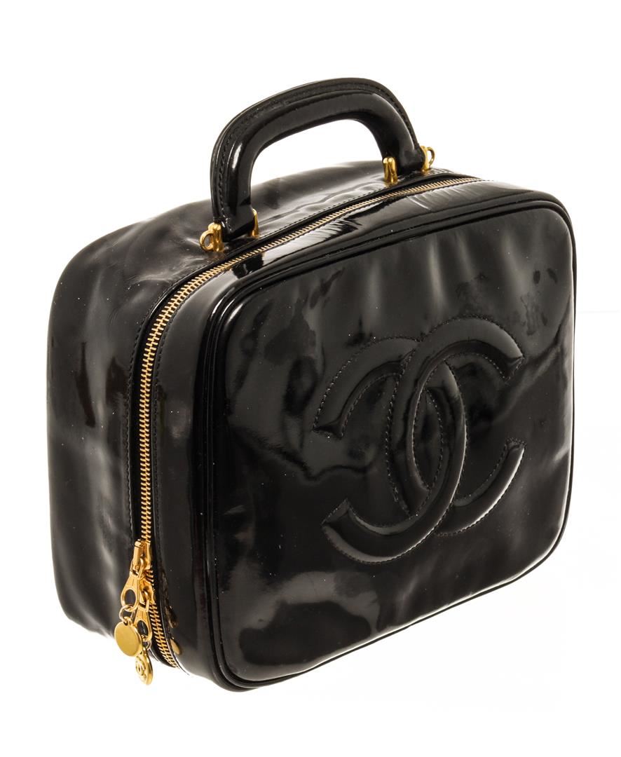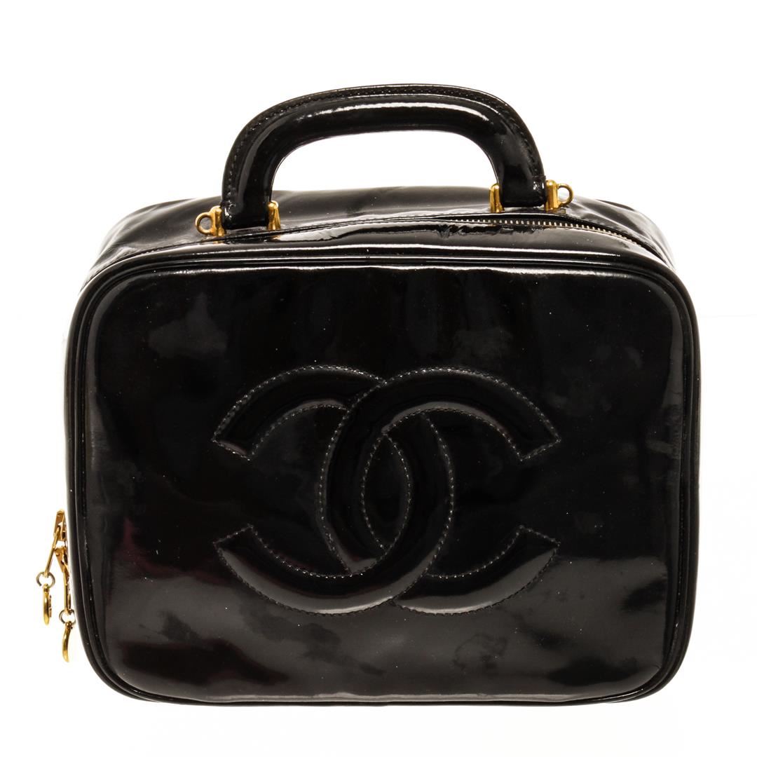 One Chanel Black Patent Leather CC Vanity Case. Item is sold AS-IS. All available information is listed in the description and shown in the photo. Chanel black patent leather CC vanity case with gold-tone hardware, black leather lining, two-way zip closure, one top handle, a CC logo stitched on the front side, a detachable long strap, one interior zip pocket, and a snap button inside. Height: 6" Width: 8" Depth: 4" , Handle Drop: / 15.24 x 20.32 x 10.16 Cm