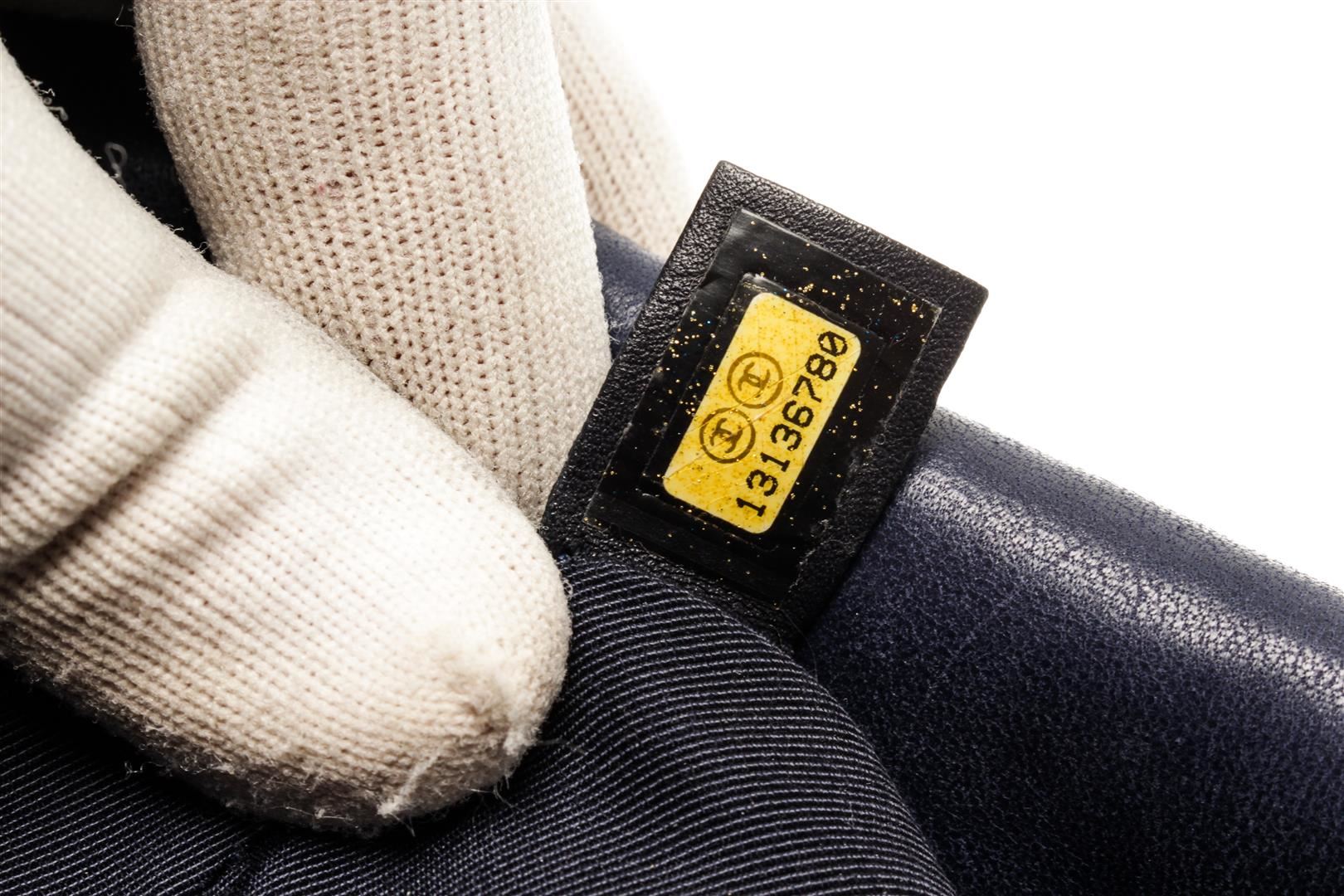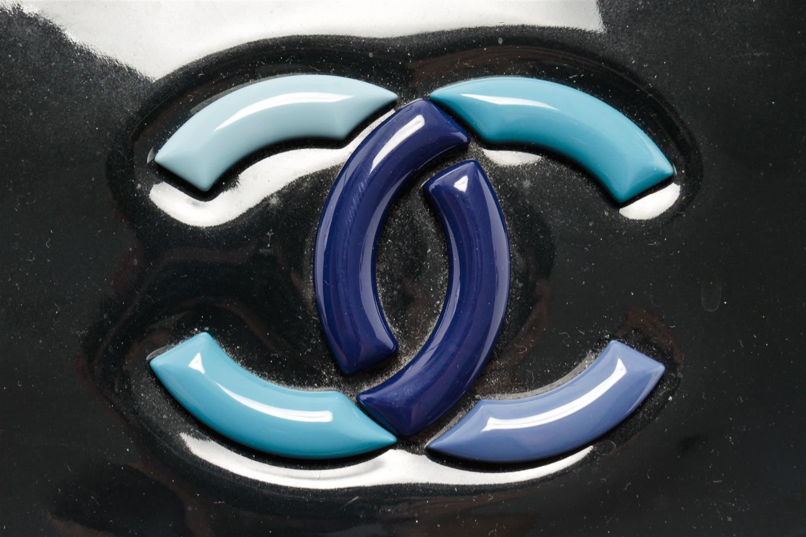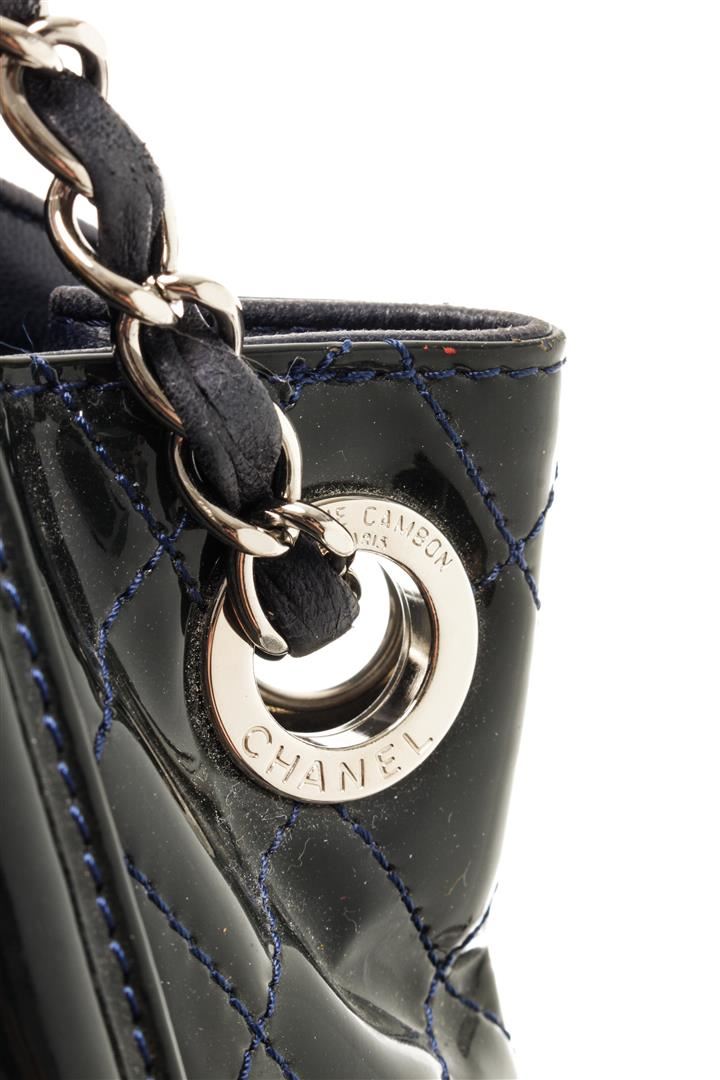 One Chanel Black Patent Leather Flap Shoulder Bag. Item is sold AS-IS. All available information is listed in the description and shown in the photo. Chanel black patent leather flap shoulder bag with navy quilts on the side exterior, silver-tone hardware, dual shoulder straps, blue interlocking cc logo at front, footing at the base, navy fabric lining, three pockets at interior walls: one with zip closure and two slip pockets, and a flap and snap closure. Height: 9" Width: 11.5" Depth: 6.5" , Shoulder Drop: 10" / 22.86 x 29.21 x 16.51 Cm