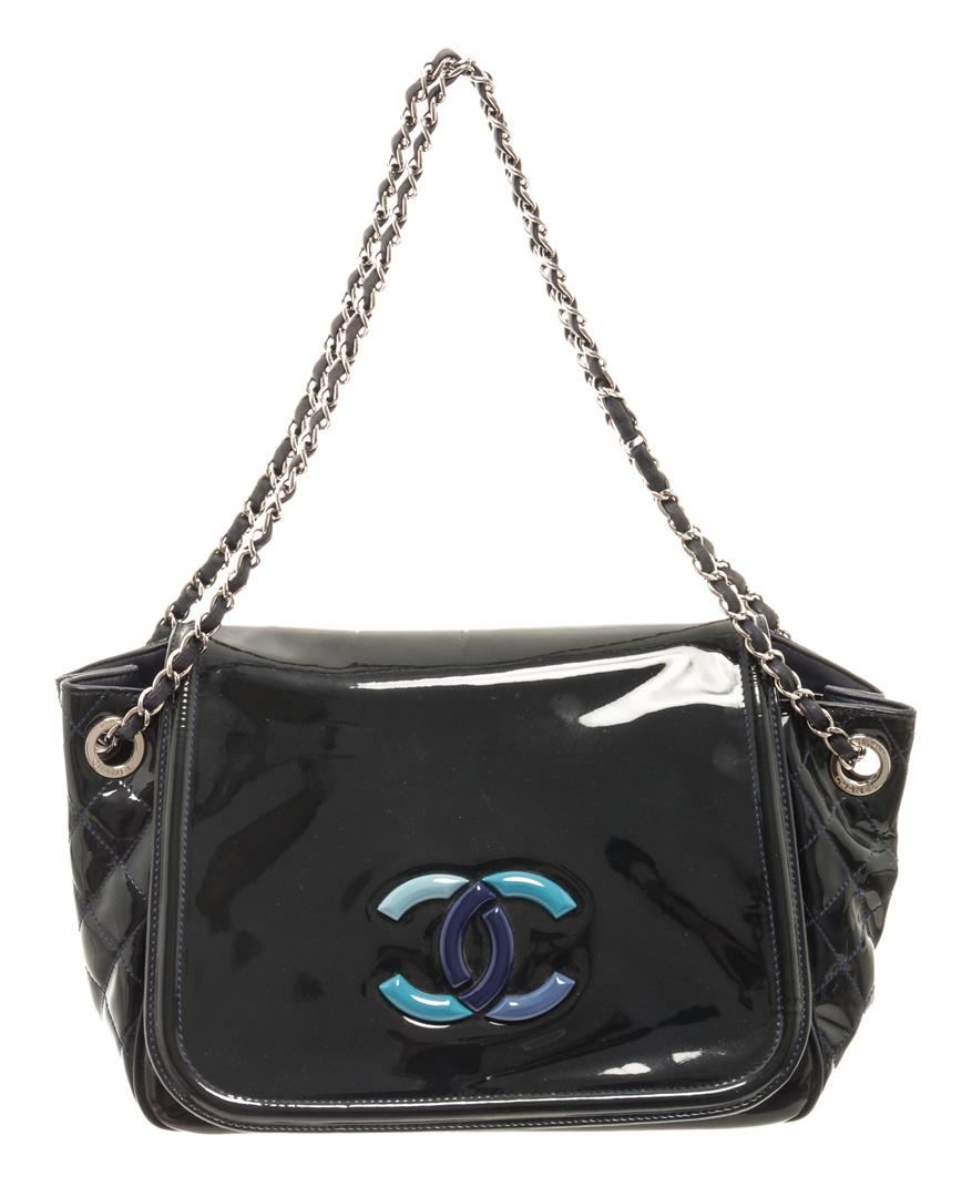 One Chanel Black Patent Leather Flap Shoulder Bag. Item is sold AS-IS. All available information is listed in the description and shown in the photo. Chanel black patent leather flap shoulder bag with navy quilts on the side exterior, silver-tone hardware, dual shoulder straps, blue interlocking cc logo at front, footing at the base, navy fabric lining, three pockets at interior walls: one with zip closure and two slip pockets, and a flap and snap closure. Height: 9" Width: 11.5" Depth: 6.5" , Shoulder Drop: 10" / 22.86 x 29.21 x 16.51 Cm