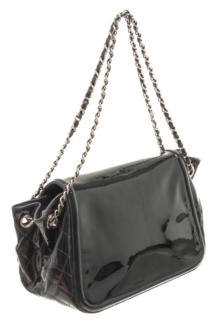 One Chanel Black Patent Leather Flap Shoulder Bag. Item is sold AS-IS. All available information is listed in the description and shown in the photo. Chanel black patent leather flap shoulder bag with navy quilts on the side exterior, silver-tone hardware, dual shoulder straps, blue interlocking cc logo at front, footing at the base, navy fabric lining, three pockets at interior walls: one with zip closure and two slip pockets, and a flap and snap closure. Height: 9" Width: 11.5" Depth: 6.5", Shoulder Drop: 10" / 22.86 x 29.21 x 16.51 Cm