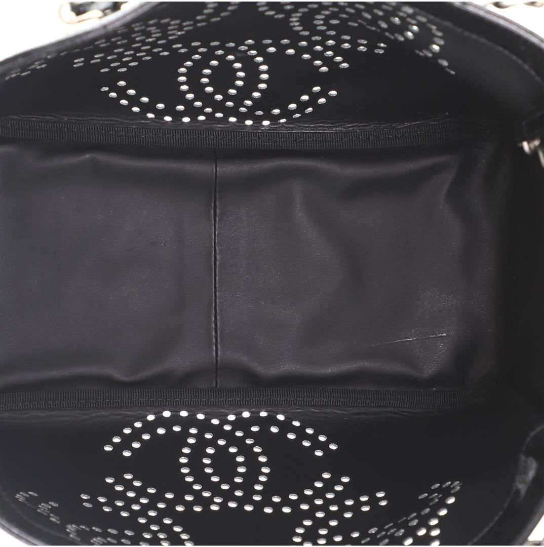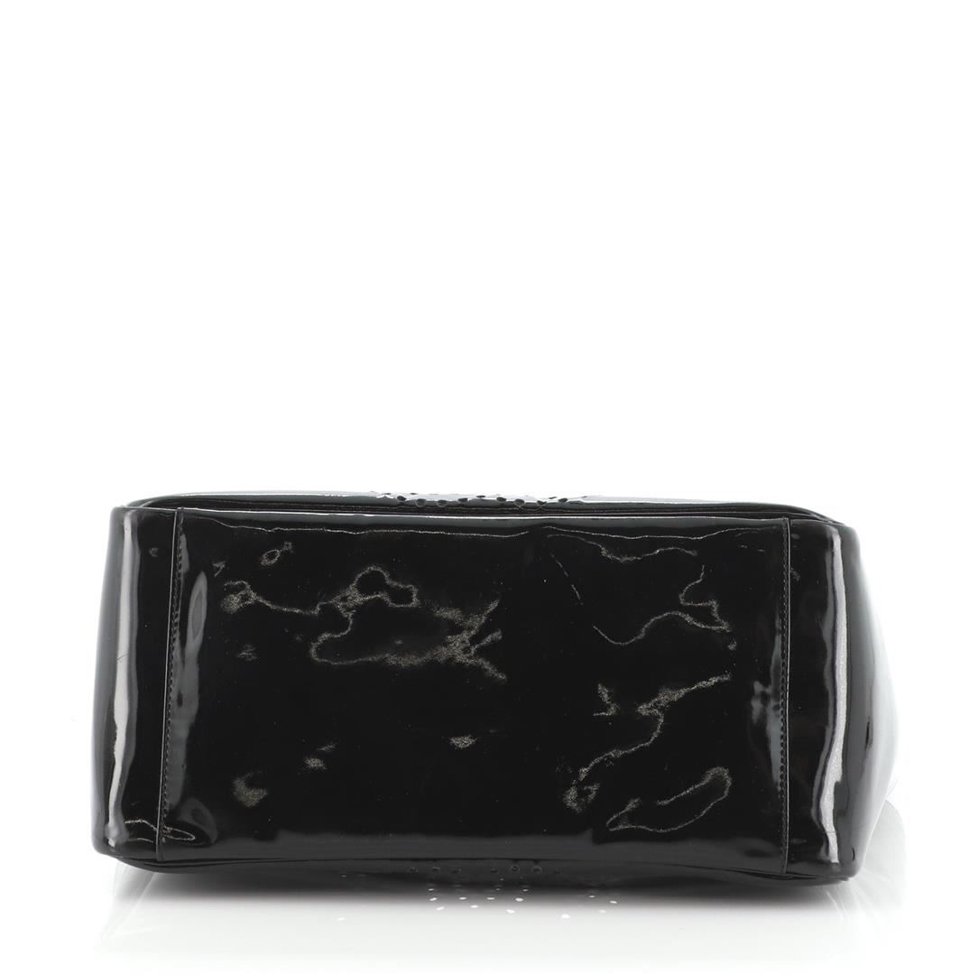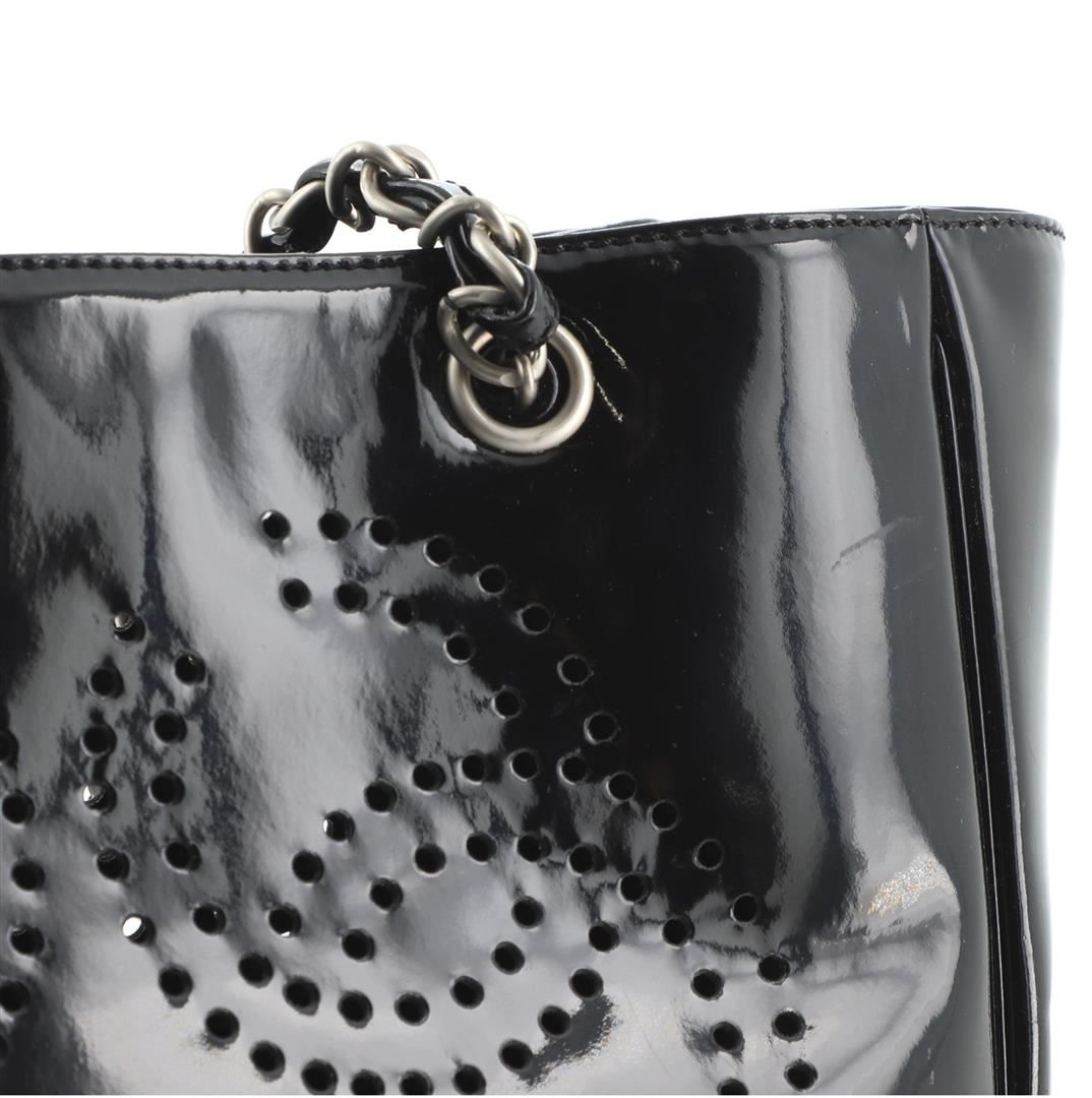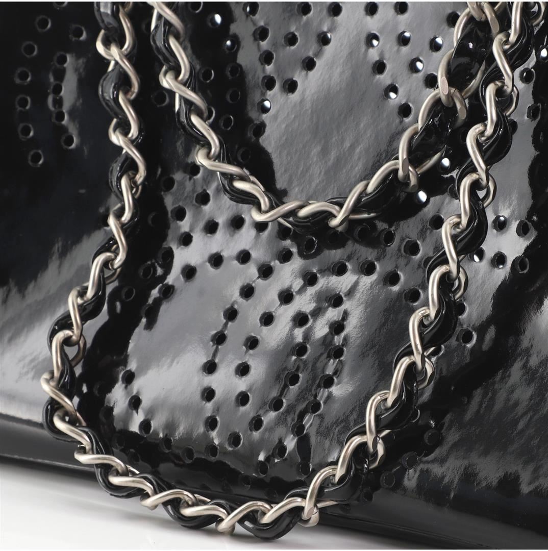 Chanel CC Medium Tote Bag features black interlocking CC perforated patent leather with brushed silver-tone hardware, dual woven leather and chain-link shoulder straps, black leather lining and open top.