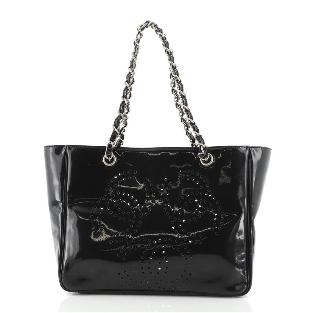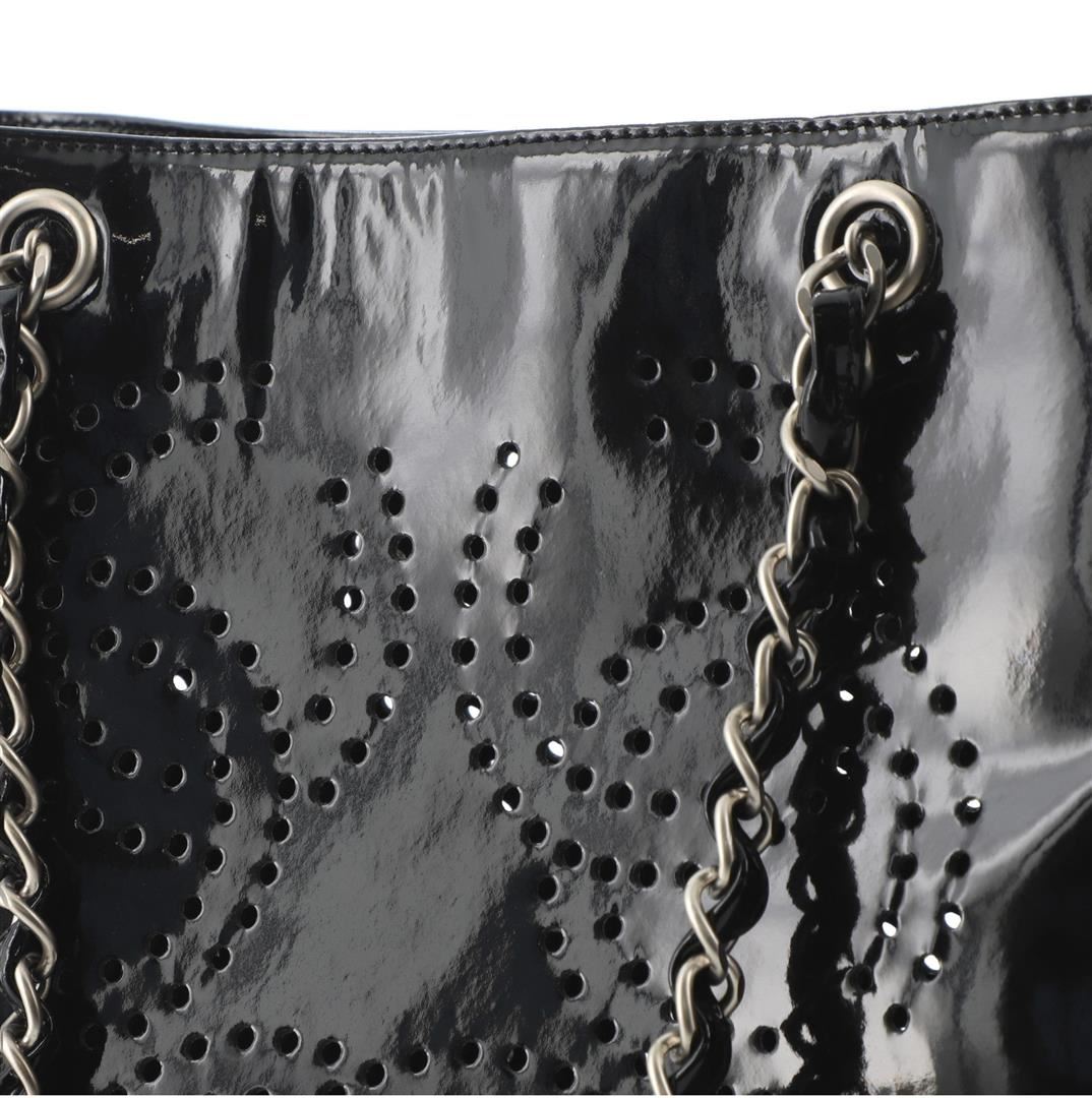 Chanel CC Medium Tote Bag features black interlocking CC perforated patent leather with brushed silver-tone hardware, dual woven leather and chain-link shoulder straps, black leather lining and open top. Height 9", Width 11", Depth 5.5"