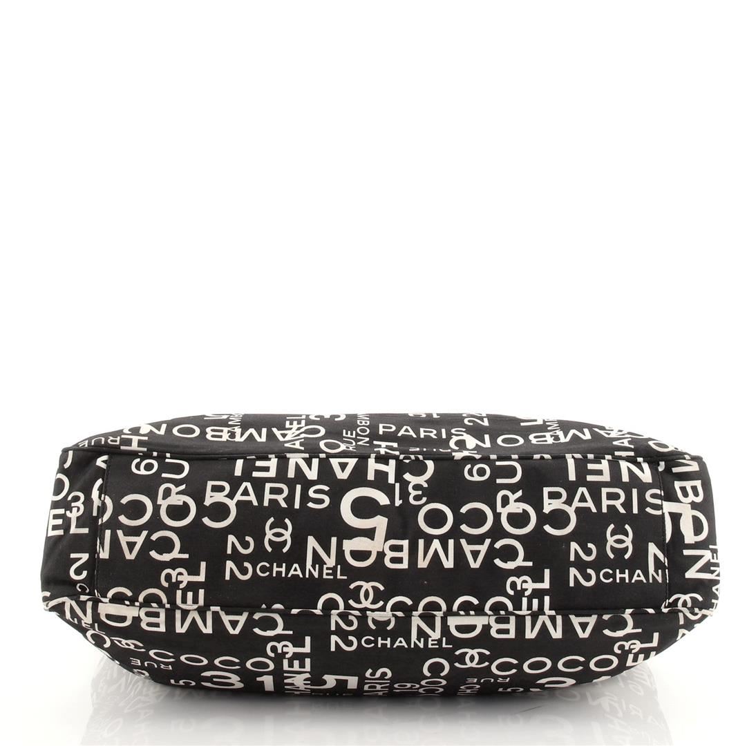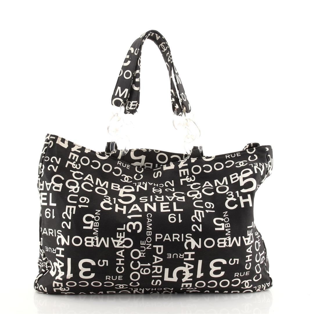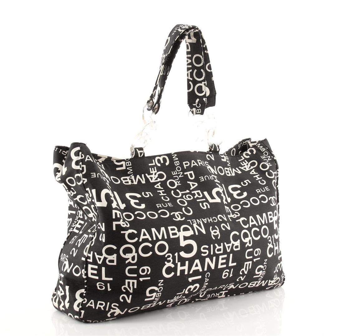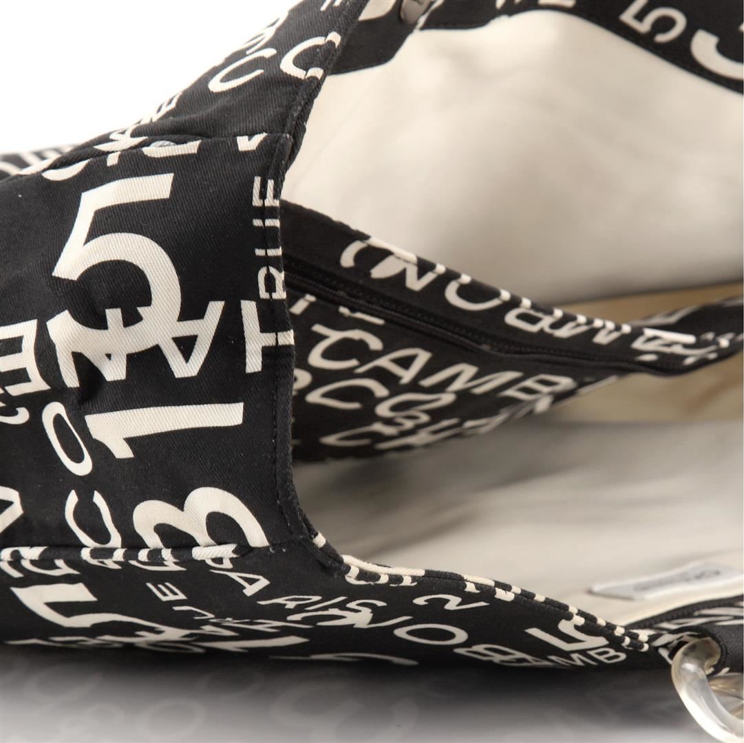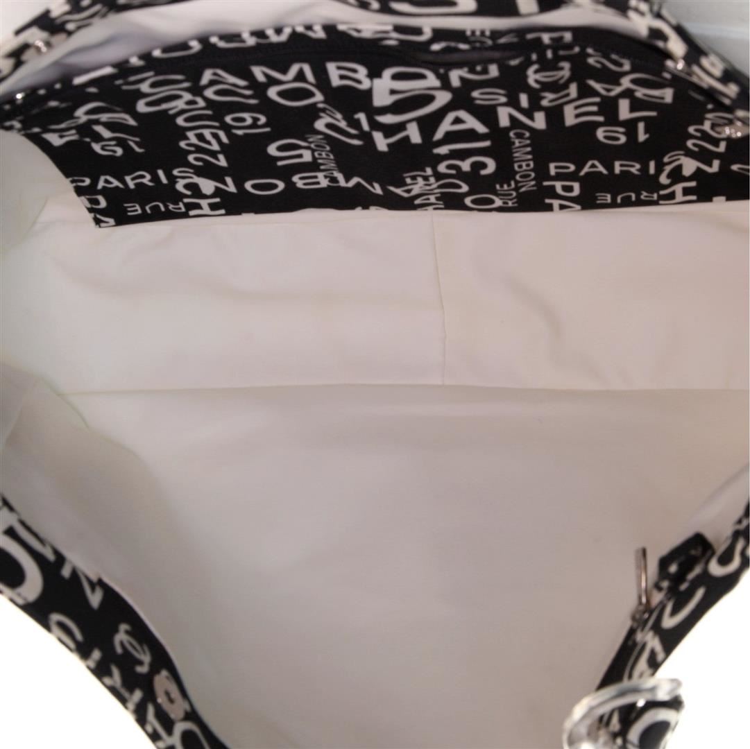 Chanel 31 Rue Cambon Beach Tote Bag features a lovely black and white printed canvas, two comfortable canvas shoulder handles and a spacious neutral canvas interior lining. The bag also comes with a cosmetic pocket/pouch, two zip pockets, double flat canv