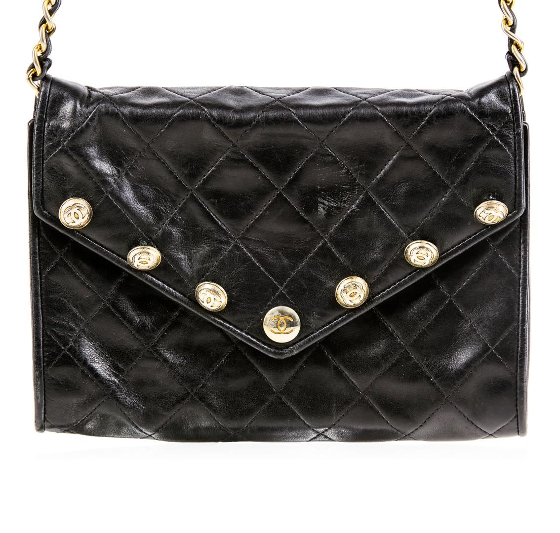 One Chanel women's black quilted leather purse. The purse features multiple attached "Chanel" logo buttons and is in good condition.
