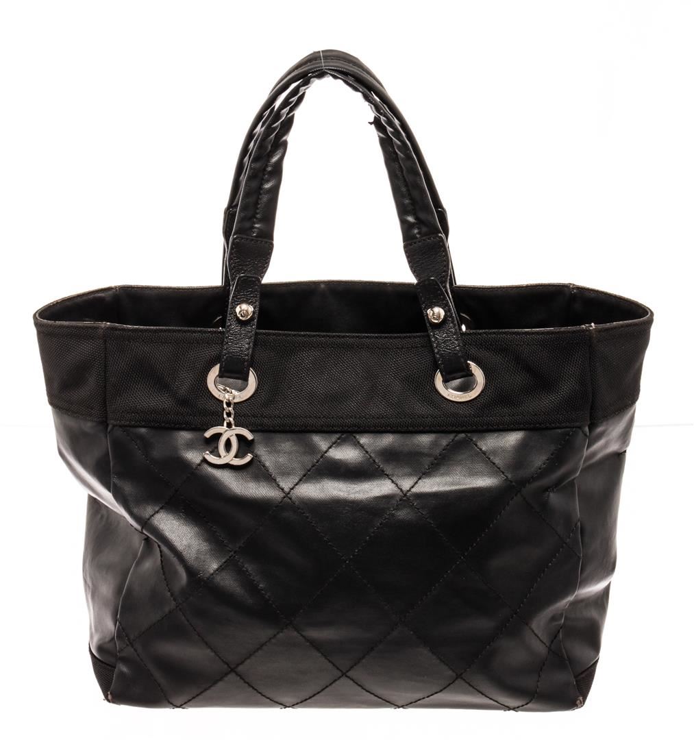 Chanel Black Quilted Coated Canvas Paris Biarritz Shoulder Bag. All available information is listed in the description and shown in the photos. Chanel Black Quilted Coated Canvas Paris Biarritz Shoulder Bag with top handle, nylon lining, interior pocket, silver tone hardware, zipper closure. Height: 11.42 in (29 cm), Width: 5.52 in (14 cm), Length: 13.78 in (35 cm)