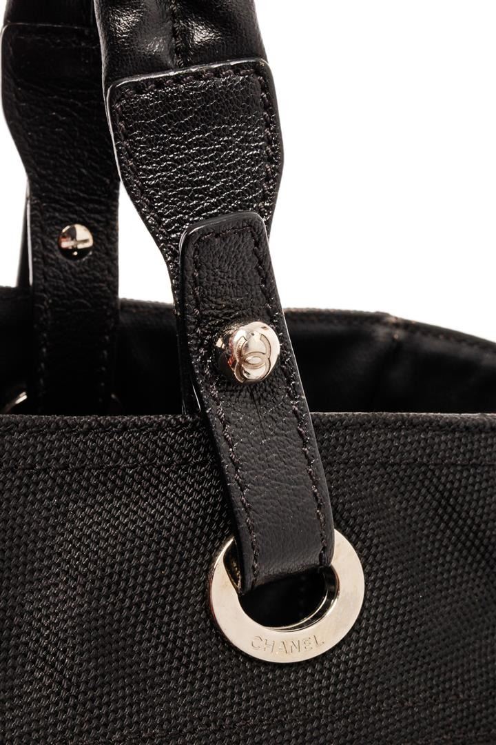 Chanel Black Quilted Coated Canvas Paris Biarritz Shoulder Bag. All available information is listed in the description and shown in the photos. Chanel Black Quilted Coated Canvas Paris Biarritz Shoulder Bag with top handle, nylon lining, interior pocket, silver tone hardware, zipper closure. Height: 11.42 in (29 cm), Width: 5.52 in (14 cm), Length: 13.78 in (35 cm)