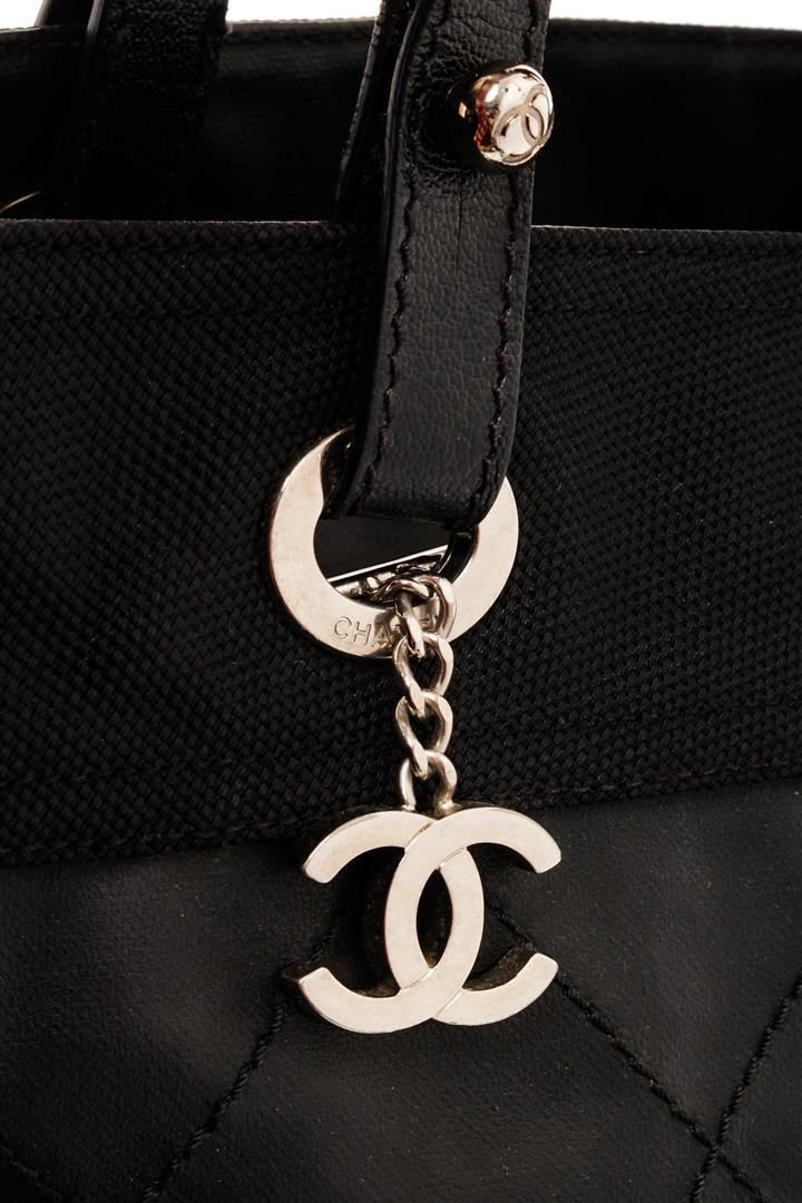 Chanel Black Quilted Coated Canvas Paris Biarritz Shoulder Bag. All available information is listed in the description and shown in the photos. Chanel Black Quilted Coated Canvas Paris Biarritz Shoulder Bag with top handle, nylon lining, interior pocket, silver tone hardware, zipper closure. Height: 11.42 in (29 cm), Width: 5.52 in (14 cm), Length: 13.78 in (35 cm)