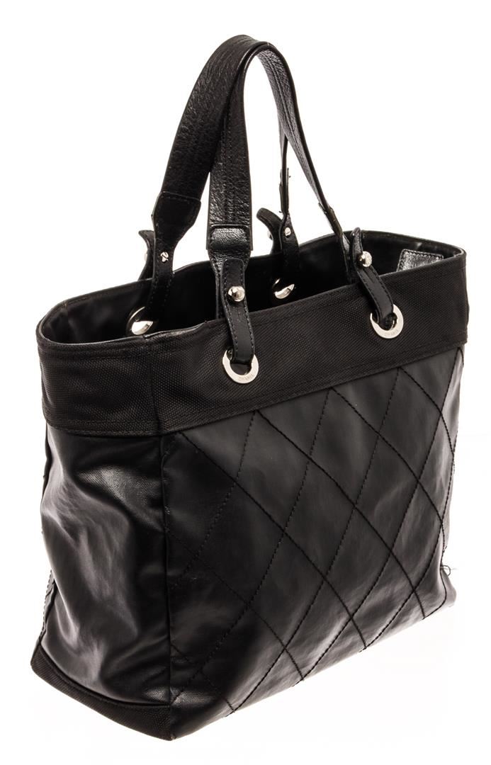 Chanel Black Quilted Coated Canvas Paris Biarritz Shoulder Bag. All available information is listed in the description and shown in the photos. Chanel Black Quilted Coated Canvas Paris Biarritz Shoulder Bag with top handles, nylon lining, interior pockets, silver hardware, zipper closure. Height: 11.42 in (29 cm), Width: 5.52 in (14 cm), Length: 13.78 in (35 cm)