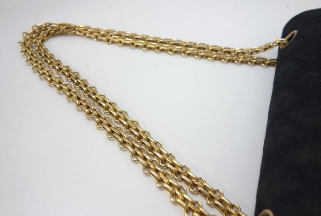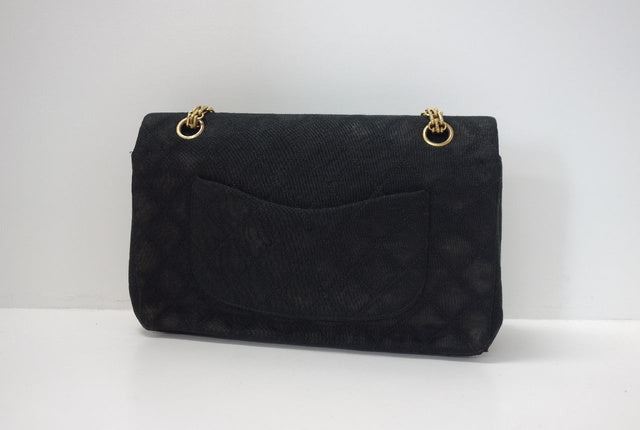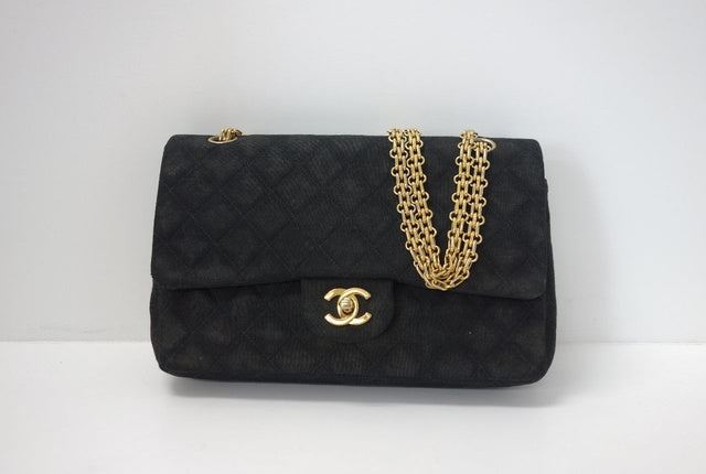 One Chanel Black Quilted Fabric Medium Flap Bag. Item is sold AS-IS. All available information is listed in the description and shown in the photo. Chanel Medium Flap Bag featured black quilted denim body with gold-tone hardware, chain shoulder strap, interlocking CC turn-lock closure and flap top that will open to red leather interior lining. PLEASE NOTE: bag has discoloration and creasing Width 9.8?³ x Height 6?³ x Depth 2.5?³