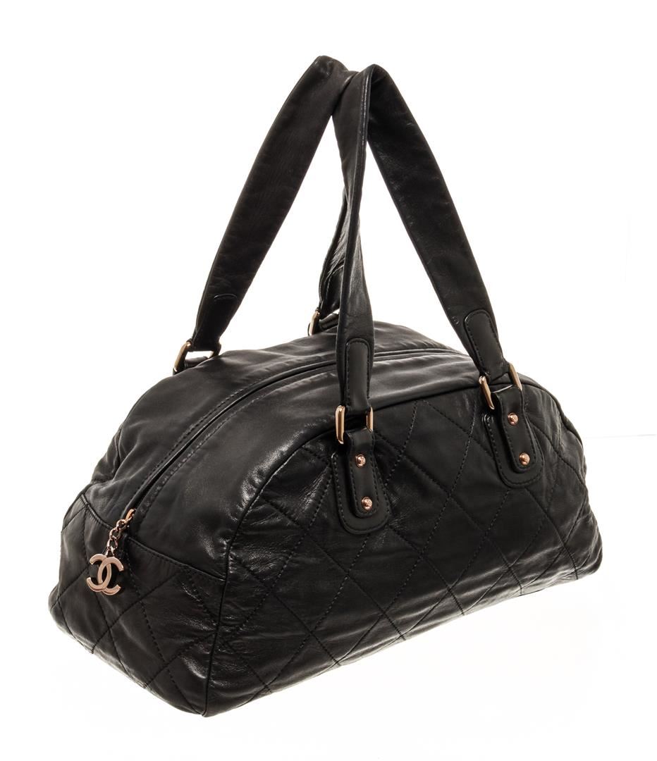 One Chanel Black Quilted Lambskin Cloudy Bundle Bowler Bag. Item is sold AS-IS. All available information is listed in the description and shown in the photo. Chanel black quilted lambskin Cloudy Bunder bowler bag with black leather exterior, black fabric lining, feet at the bottom of the bag to enable it to stand, gold-tone hardware, zipper closure, and CC interlocking logo as zipper tab. Measurements: Handle Drop 10", Height: 8.5 in (21.59 cm), Width: 16.5 in (41.91 cm), Depth: 6 in (15.24 cm)