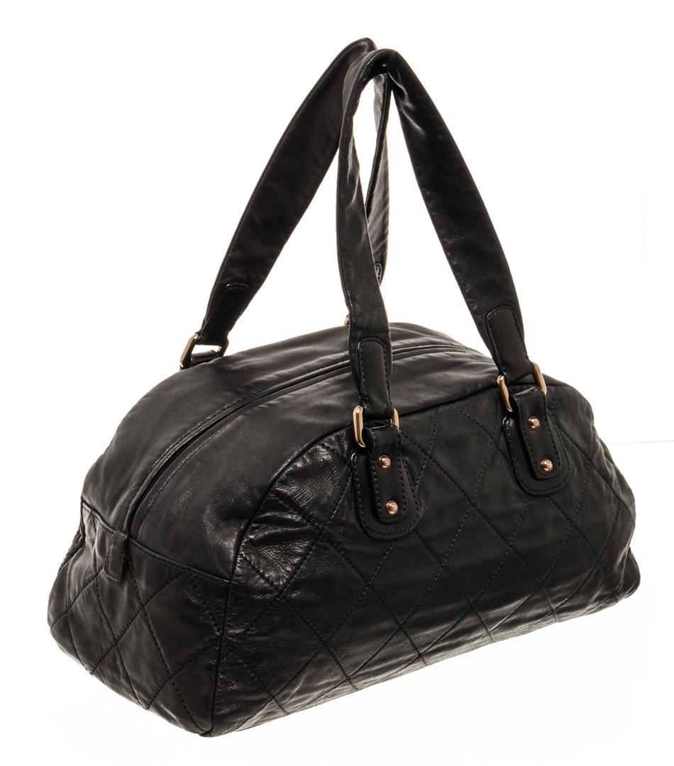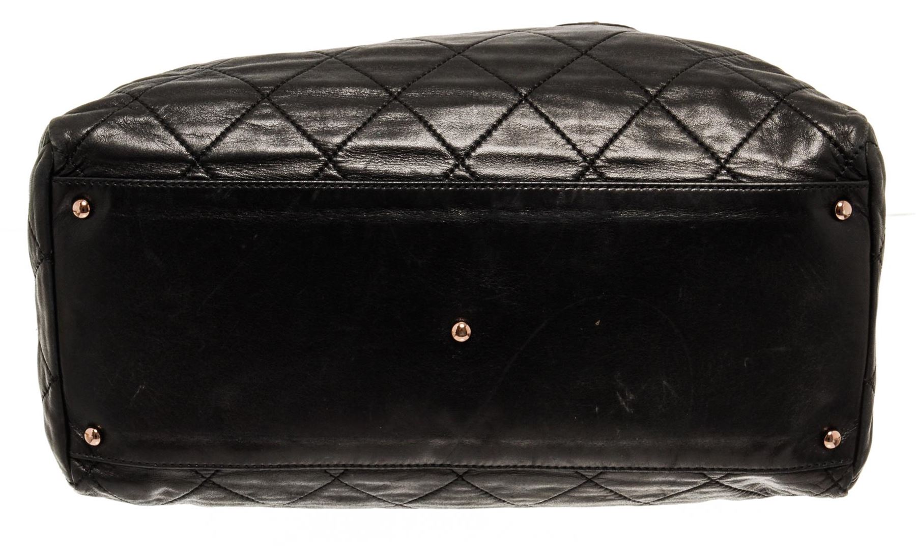 One Chanel Black Quilted Lambskin Cloudy Bundle Bowler Bag. Item is sold AS-IS. All available information is listed in the description and shown in the photo. Chanel black quilted lambskin Cloudy Bunder bowler bag with black leather exterior, black fabric lining, feet at the bottom of the bag to enable it to stand, gold-tone hardware, zipper closure, and CC interlocking logo as zipper tab. Measurements: Handle Drop 10", Height: 8.5 in (21.59 cm), Width: 16.5 in (41.91 cm), Depth: 6 in (15.24 cm)