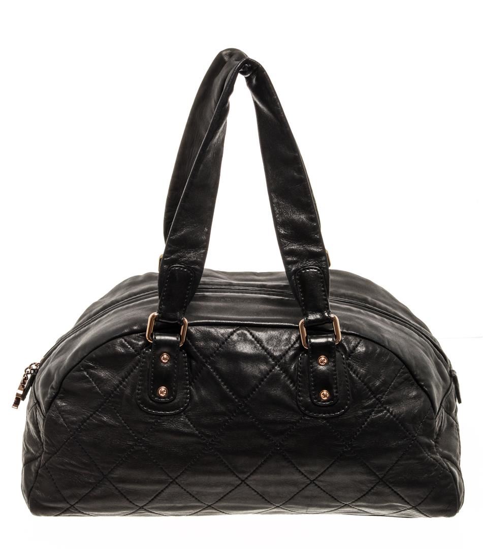 One Chanel Black Quilted Lambskin Cloudy Bundle Bowler Bag. Item is sold AS-IS. All available information is listed in the description and shown in the photo. Chanel black quilted lambskin Cloudy Bunder bowler bag with black leather exterior, black fabric lining, feet at the bottom of the bag to enable it to stand, gold-tone hardware, zipper closure, and CC interlocking logo as zipper tab. Measurements: Handle Drop 10", Height: 8.5 in (21.59 cm), Width: 16.5 in (41.91 cm), Depth: 6 in (15.24 cm)