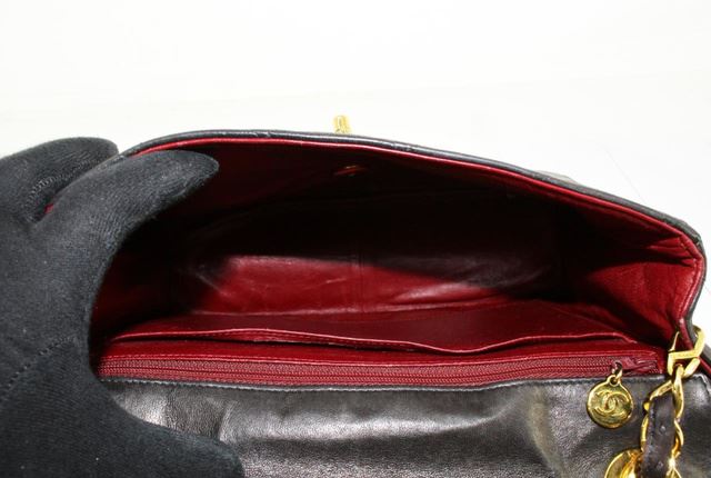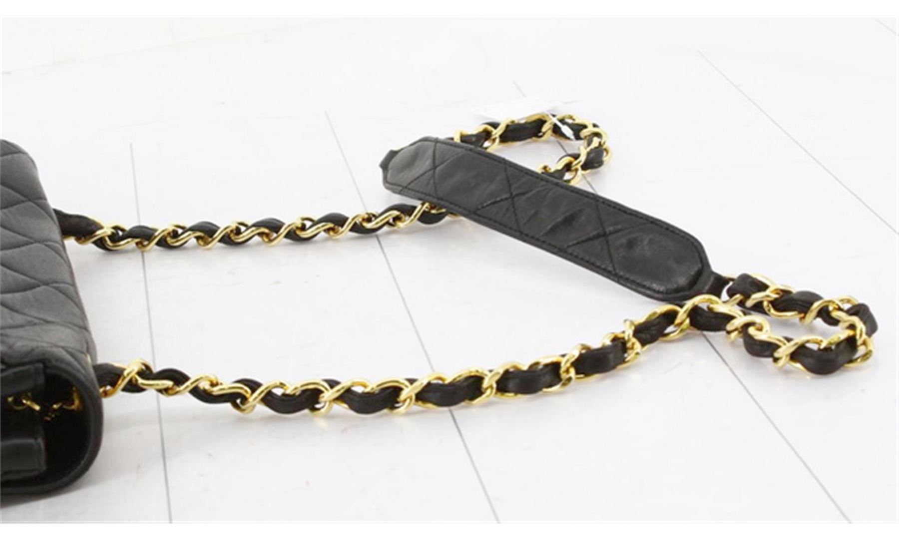One Chanel Black Quilted Lambskin Leather CC Square Medium Flap Shoulder Bag. Item is sold AS-IS. All available information is listed in the description and shown in the photo. This Chanel Vintage Square CC Flap medium shoulder bag is crafted from black quilted Lambskin leather, features woven-in leather chain strap, and gold-tone hardware. Its flap with interlocking CC turn-lock closure opens to a red leather interior with zip and slip pockets and an exterior slip pocket on rear. Height 10", Width 11", Depth 4", Strap Drop 18"