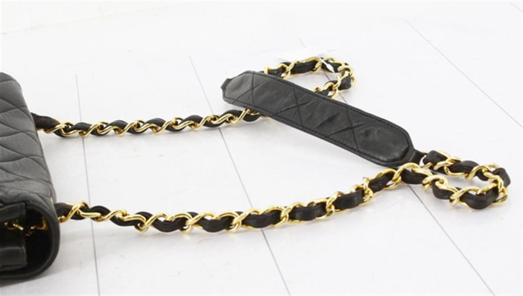 One Chanel Black Quilted Lambskin Leather CC Square Medium Flap Shoulder Bag. Item is sold AS-IS. All available information is listed in the description and shown in the photo. This Chanel Vintage Square CC Flap medium shoulder bag is crafted from black quilted Lambskin leather, features woven-in leather chain strap, and gold-tone hardware. Its flap with interlocking CC turn-lock closure opens to a red leather interior with zip and slip pockets and an exterior slip pocket on rear. Height 10", Width 11", Depth 4", Strap Drop 18"