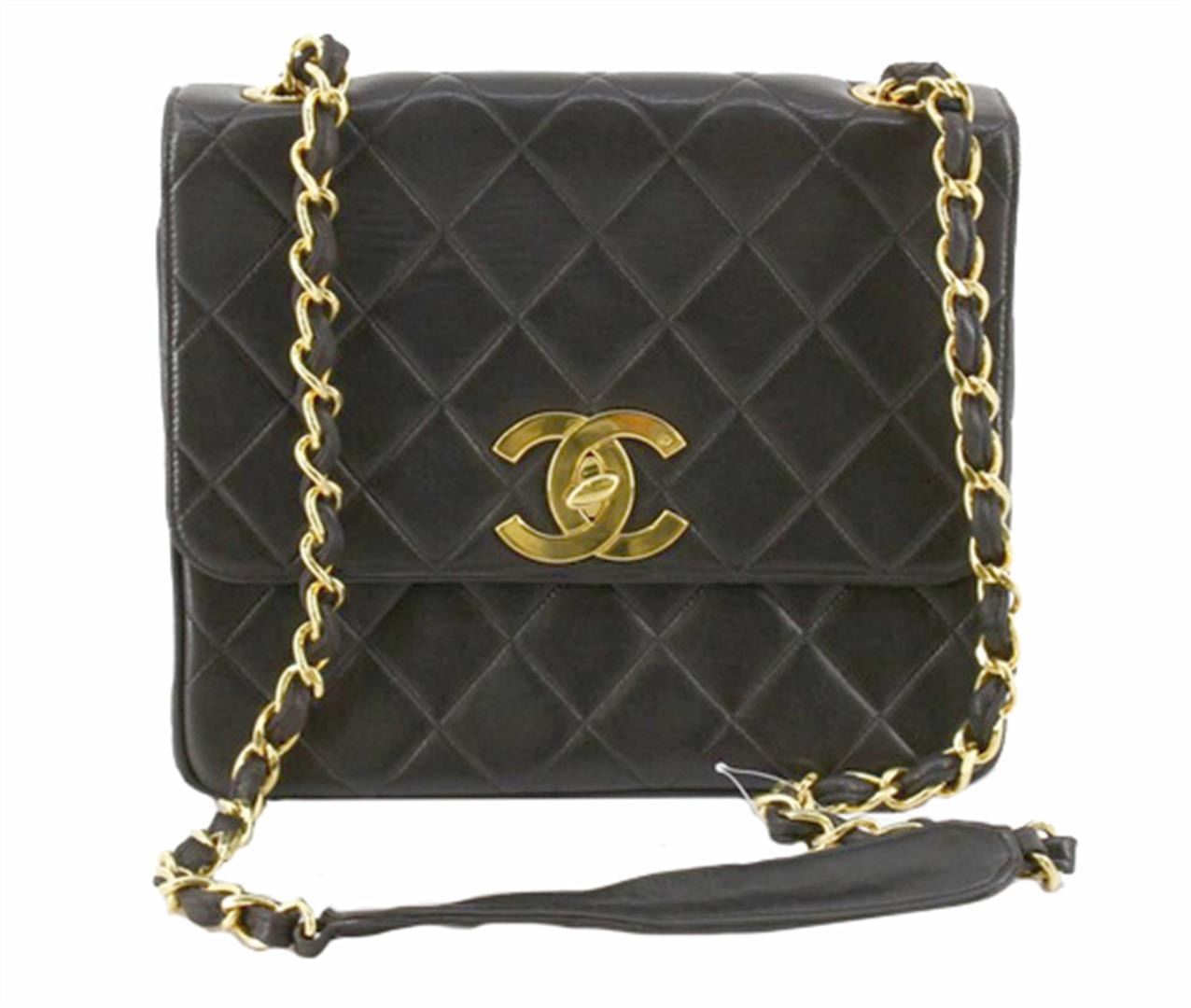 One Chanel Black Quilted Lambskin Leather CC Square Medium Flap Shoulder Bag. Item is sold AS-IS. All available information is listed in the description and shown in the photo. This Chanel Vintage Square CC Flap medium shoulder bag is crafted from black quilted Lambskin leather, features woven-in leather chain strap, and gold-tone hardware. Its flap with interlocking CC turn-lock closure opens to a red leather interior with zip and slip pockets and an exterior slip pocket on rear. Height 10", Width 11", Depth 4", Strap Drop 18"