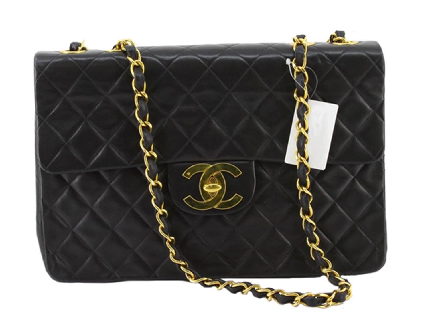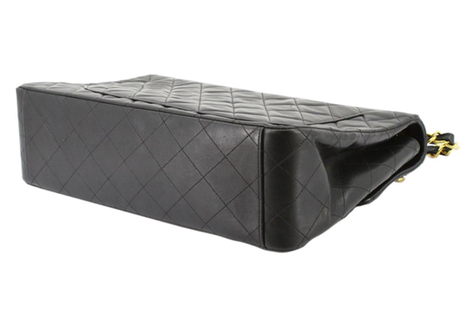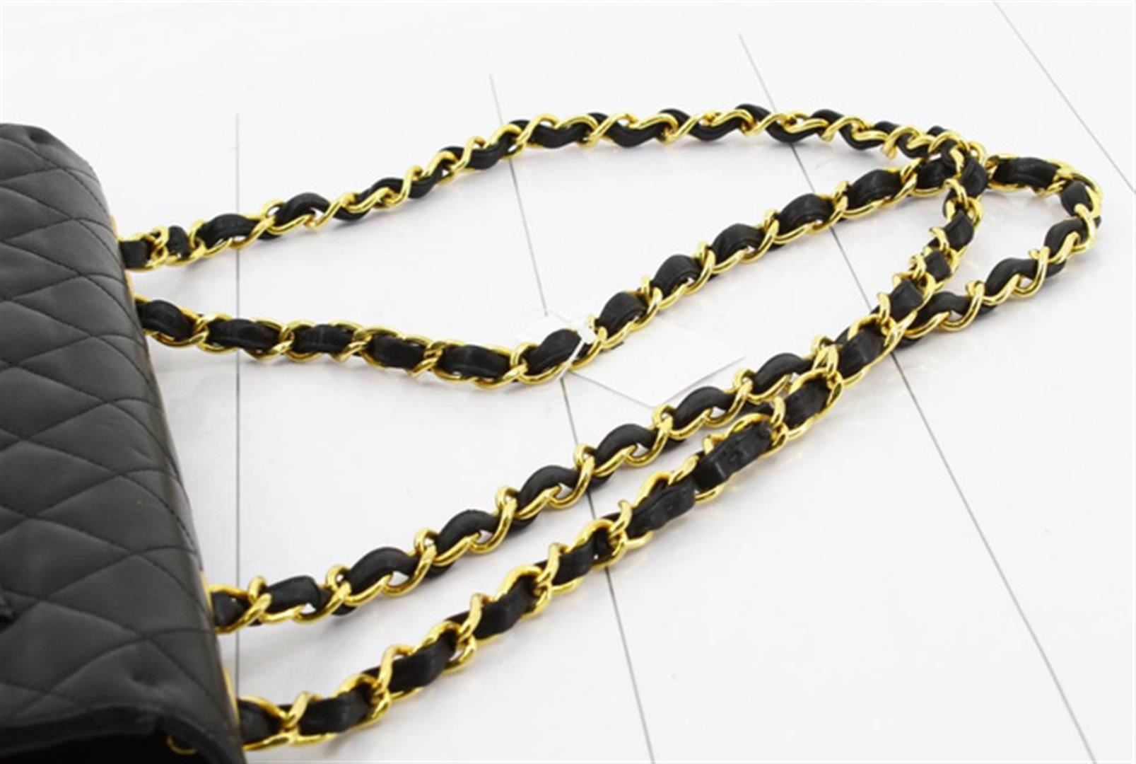 Chanel Flap bag is crafted of soft black diamond-quilted Lambskin leather and features a prominent gold-tone hardware, an interlocking CC turn-lock closure at the front, a long woven leather and gold-tone chain shoulder strap and a patch pocket at back. T