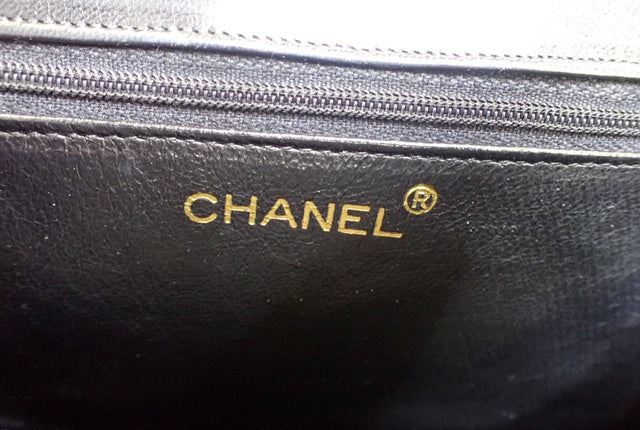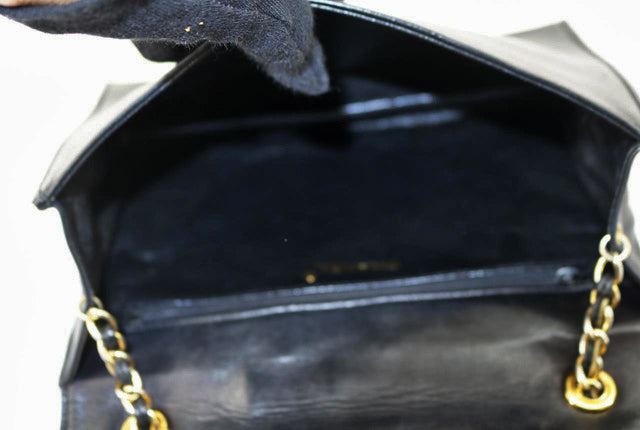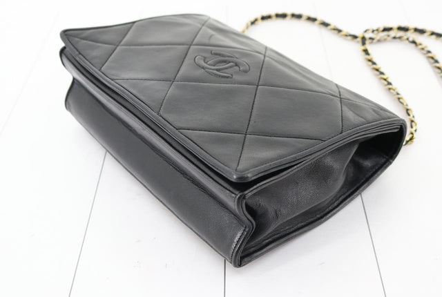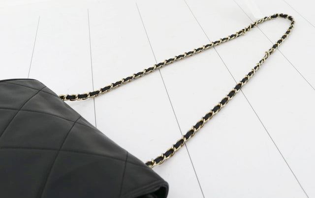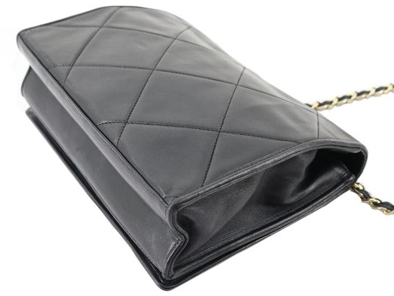 Black diamond-quilted Lambskin leather Chanel CC Flap shoulder bag with gold-tone hardware, signature interlocking CC logo stitched at the front flap, interwoven leather and chain-link shoulder strap, foldover top with magnetic fastening, main compartment