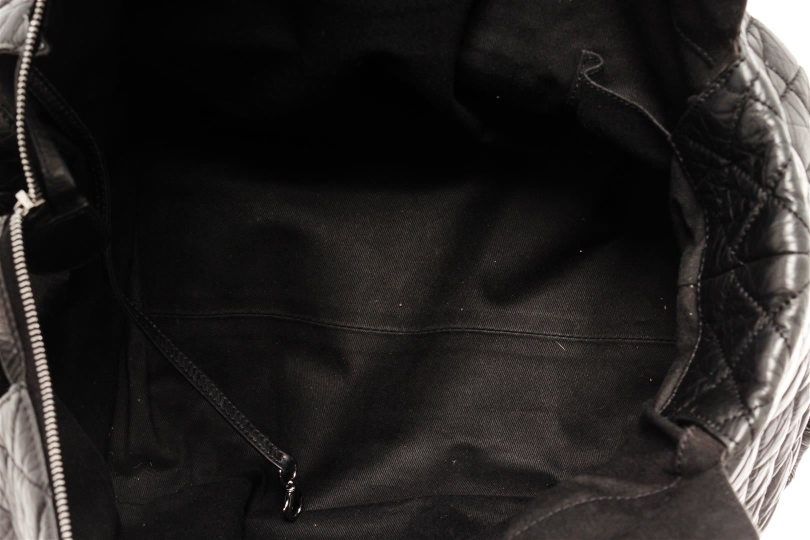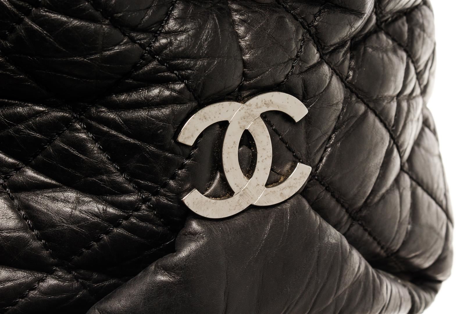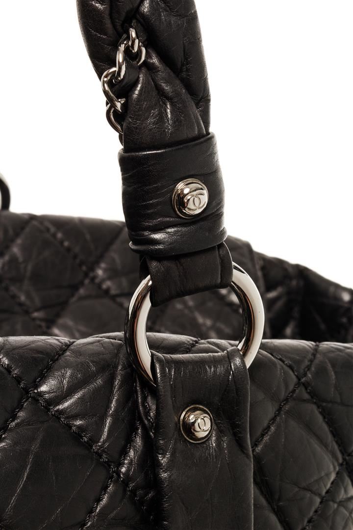 One Chanel Black Quilted Lambskin Ligne Lady Braid XL Tote Bag. Item is sold AS-IS. All available information is listed in the description and shown in the photo. Chanel Black Quilted Lambskin Ligne Lady Braid XL Tote Bag with silver-tone hardware, leather trim, foot base, exterior zip pocket, black fabric lining, interior zip pocket, dual lady braid chain leather handles, and zipper closure at the top. .