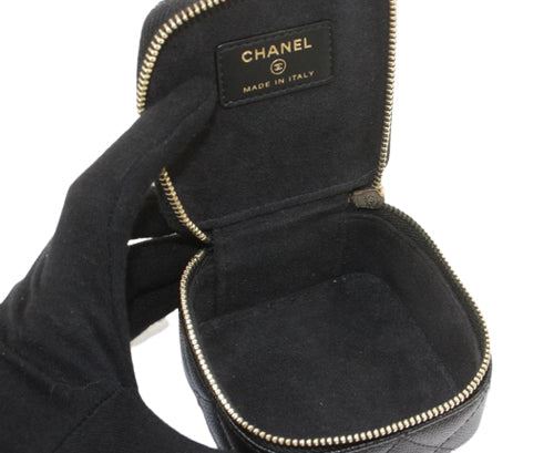 Chanel Black Quilted Leather Jewelry Box. All available information is listed in the description and shown in the photos. Black quilted leather Chanel jewelry box with gold-tone hardware, a small interlocking CC logo on top, zip-around closure that will open to black suede-lined interior. 3"W x 2"H x 3"D