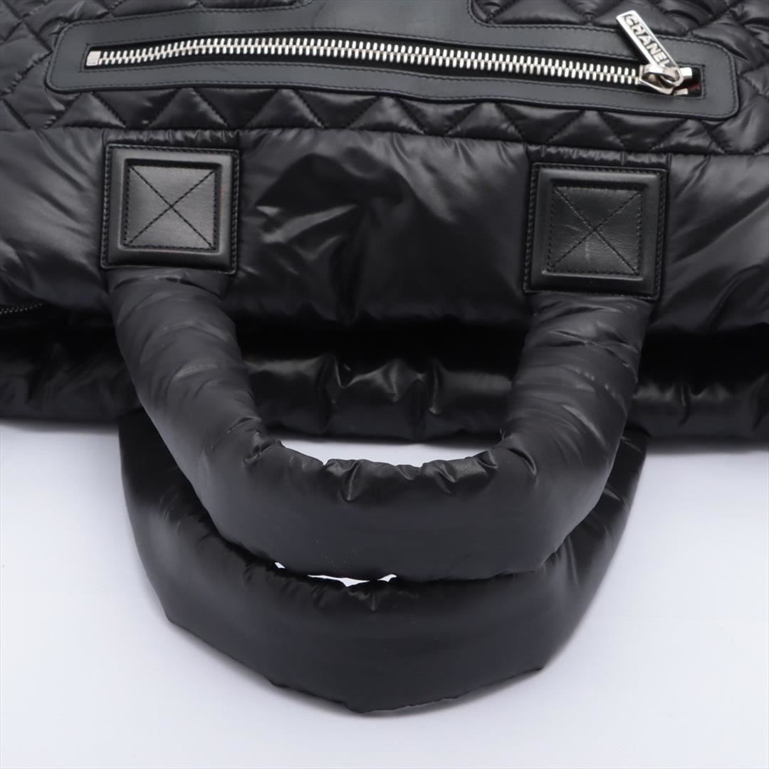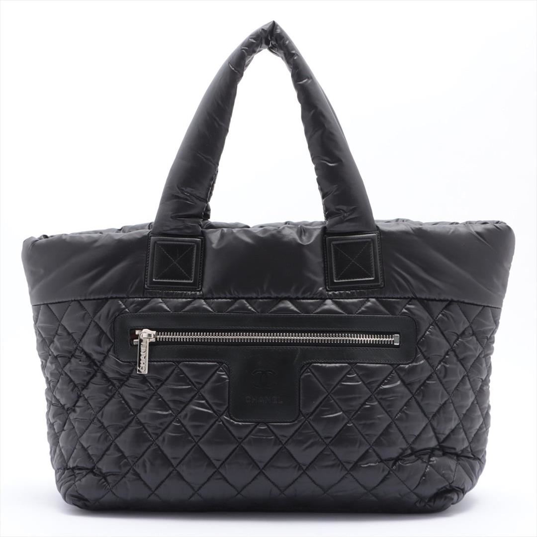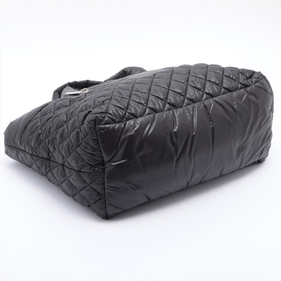 Chanel Coco Cocoon Reversible Medium tote quilted in black and burgundy nylon. Features padded top handles, exterior zip pocket, and silver-tone hardware. Opens with a zip closure to a reversible burgundy nylon interior with a zip pocket. 15" x 12" x 7", Handle Drop : 8"