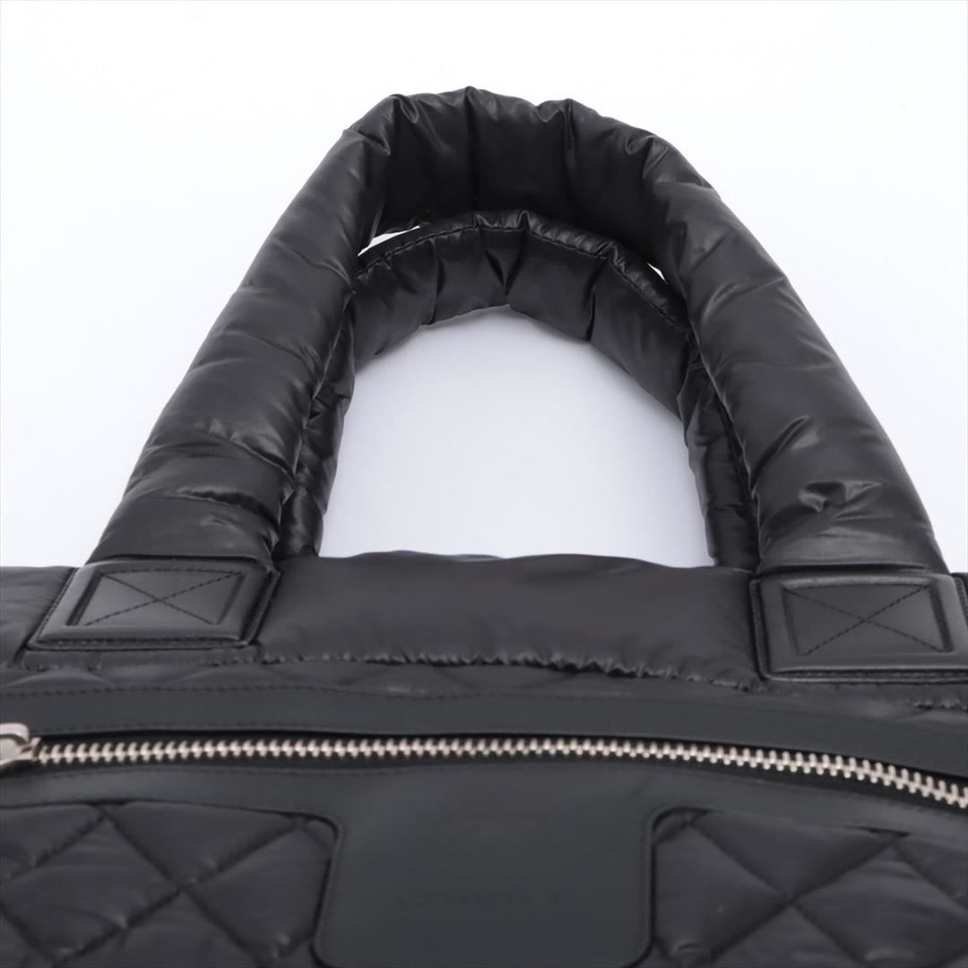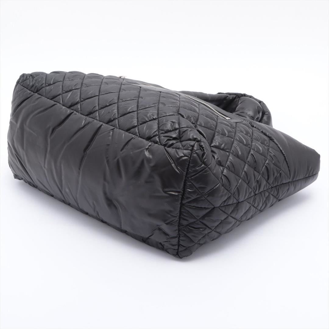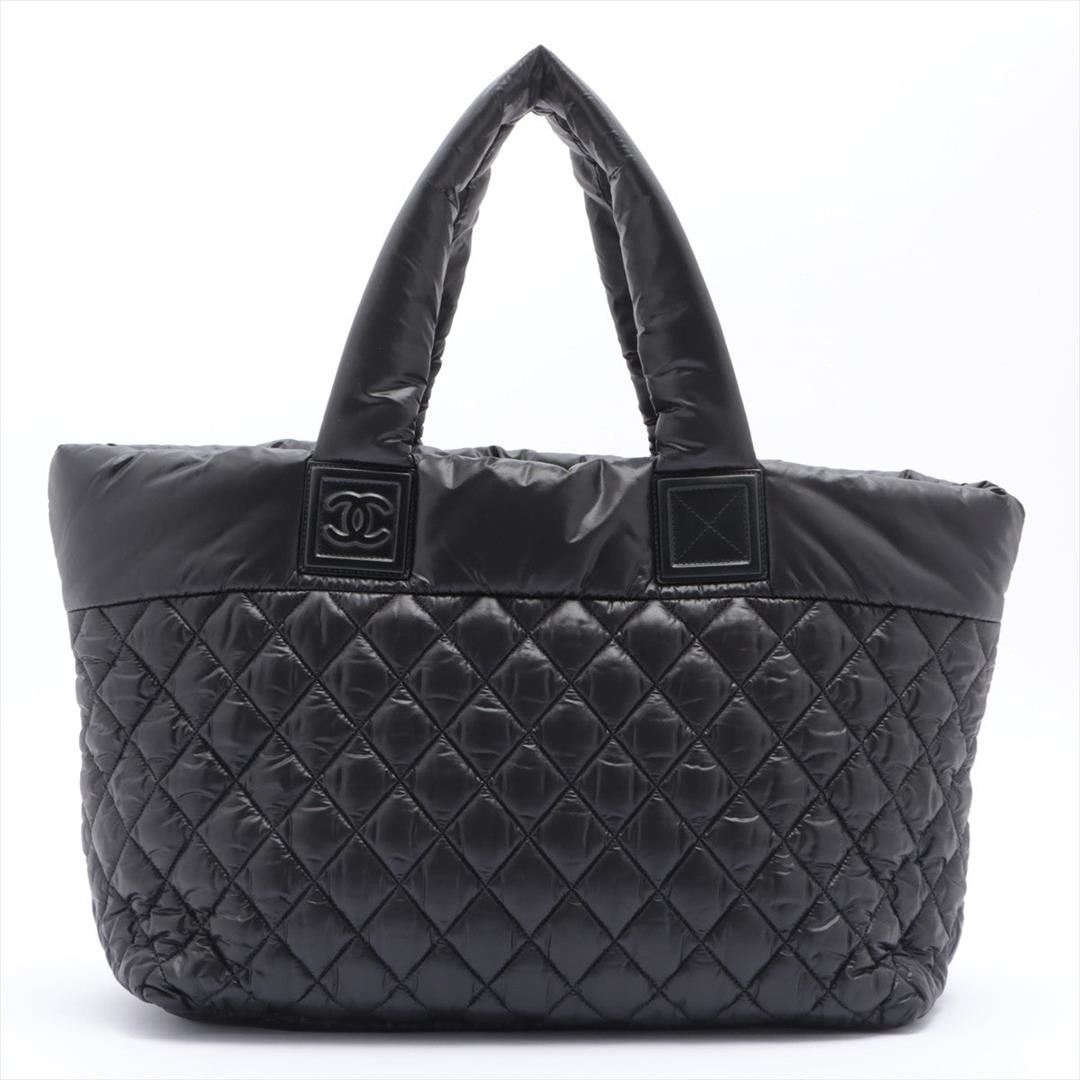Chanel Coco Cocoon Reversible Medium tote quilted in black and burgundy nylon. Features padded top handles, exterior zip pocket, and silver-tone hardware. Opens with a zip closure to a reversible burgundy nylon interior with a zip pocket. 15" x 12" x 7", Handle Drop : 8"