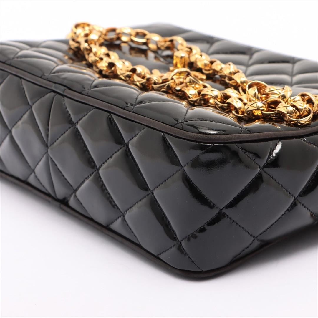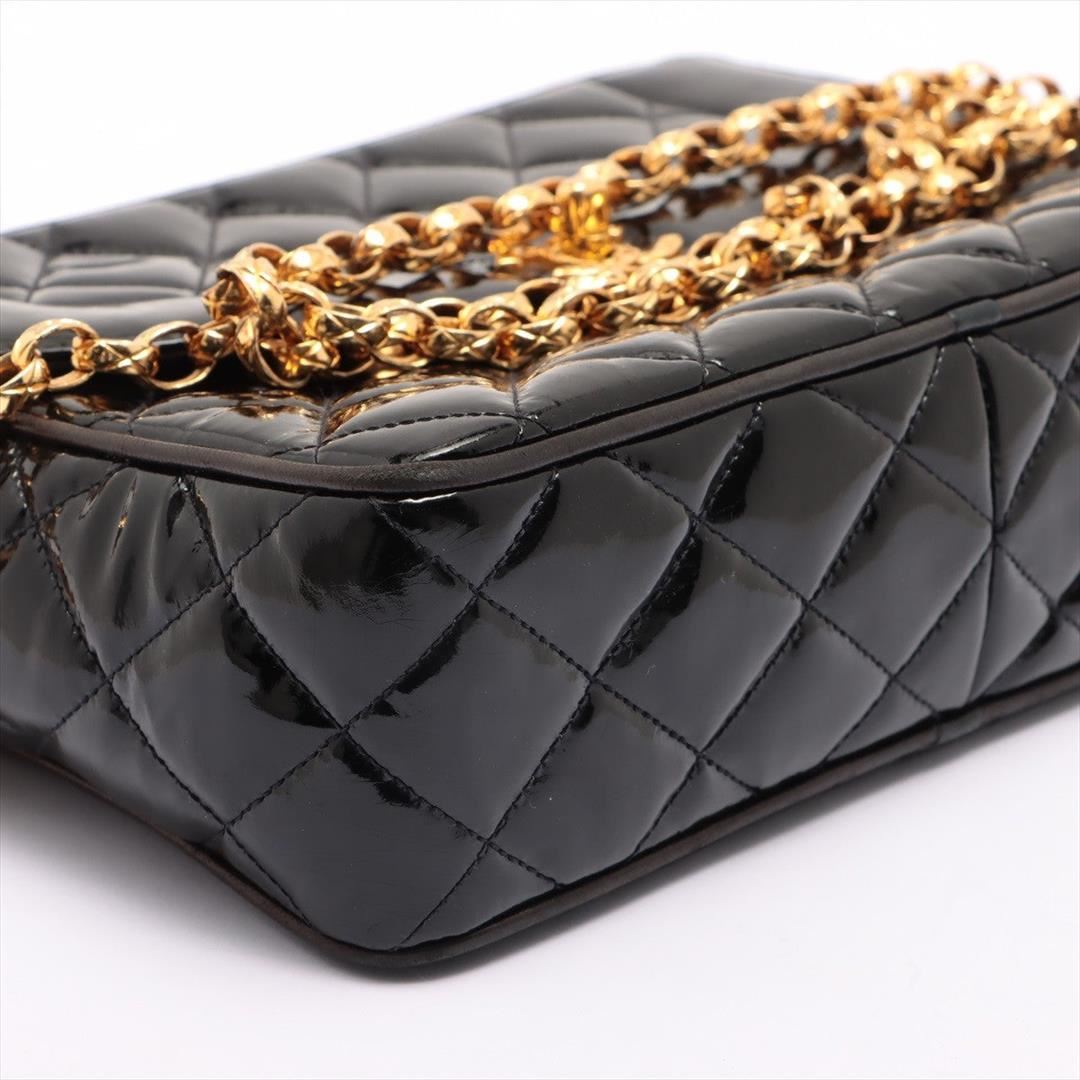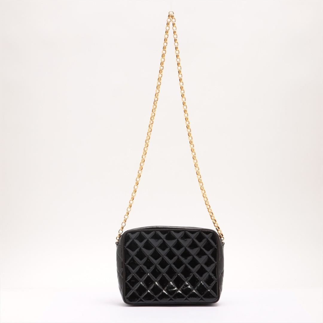 One Chanel Black Quilted Patent Leather CC Diana Camera Shoulder Bag. Item is sold AS-IS. All available information is listed in the description and shown in the photo. Black quilted patent leather Chanel CC Diana Camera shoulder bag with gold-tone hardware, chain-link shoulder strap, a front pocket with an interlocking CC turn-lock closure, zip closure at top that will open to black leather-lined interior with one flat pocket and one zipped pocket inside.