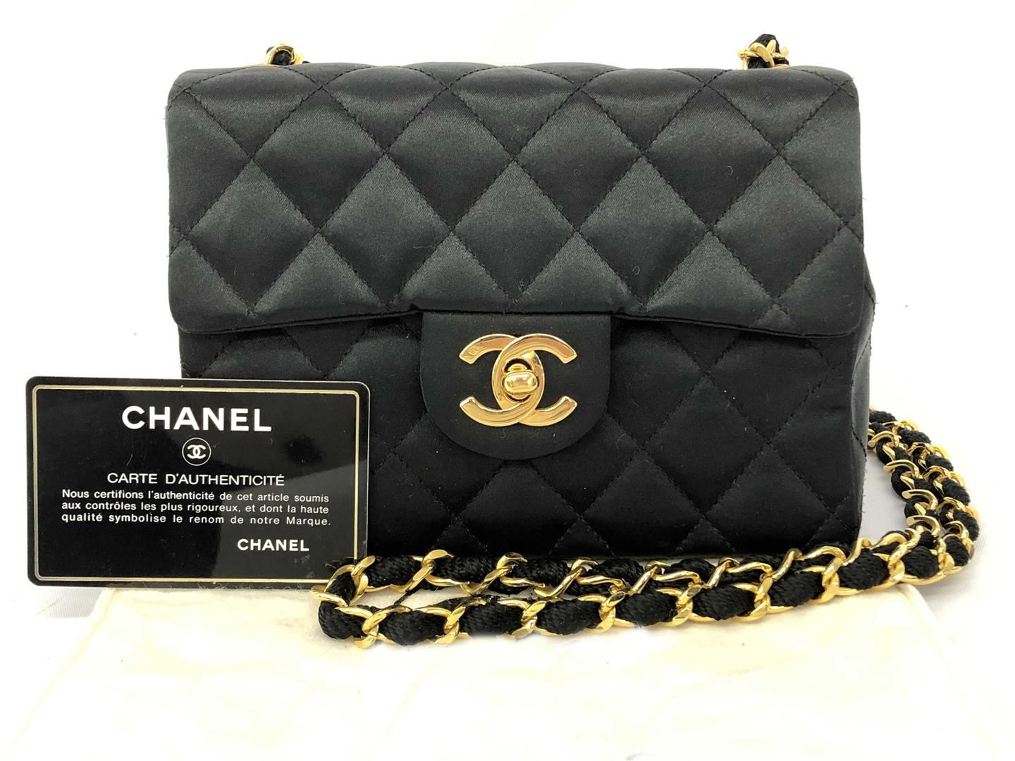 This Chanel Mini flap bag features black quilted satin, woven canvas & chain-link shoulder strap, a front flap & interlocking CC turn-lock on the front and open slip in pocket on the back. Inside has black satin lining and 2 pockets; 1 zipper and 1 open.