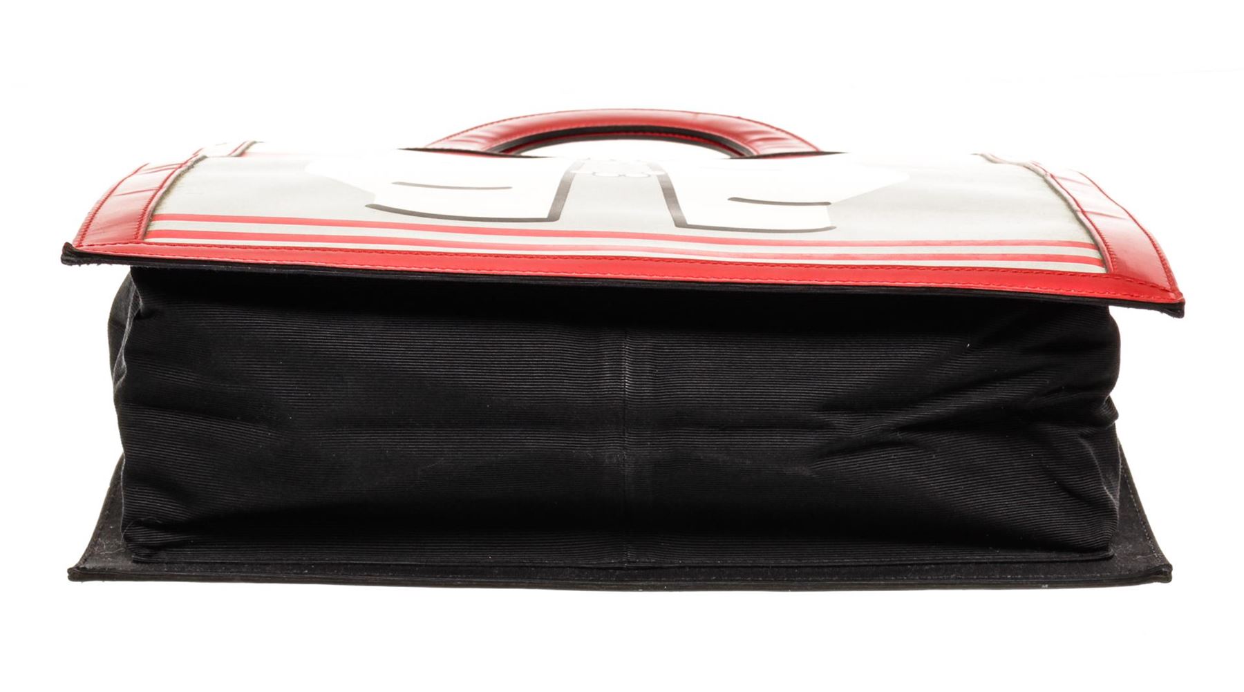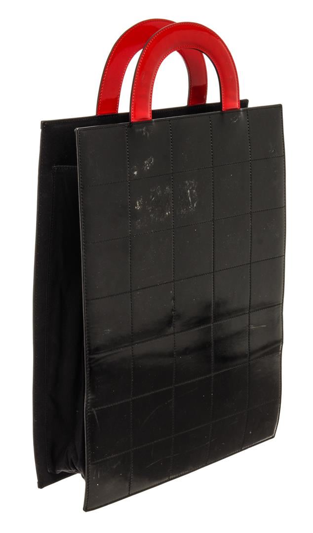 One Chanel Black Red Graphic Print Vintage Mademoiselle Tote Bag. Item is sold AS-IS. All available information is listed in the description and shown in the photo. Chanel Black Red Graphic Print Vintage Mademoiselle Tote Bag with patent leather trim, interior black canvas lining, interior slip and zip pockets, dual flat top handles, and open closure. Please note: scratches and material burn on bay of bag, please see photographs. .