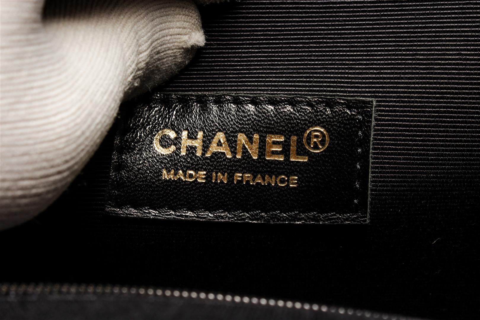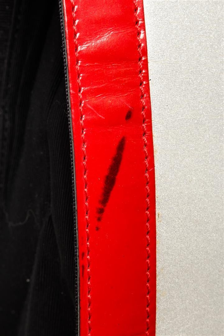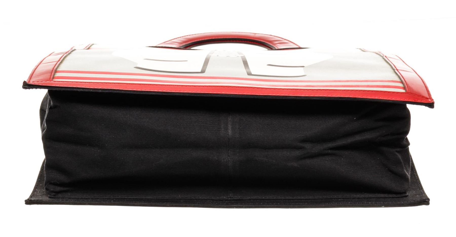 One Chanel Black Red Graphic Print Vintage Mademoiselle Tote Bag. Item is sold AS-IS. All available information is listed in the description and shown in the photo. Chanel Black Red Graphic Print Vintage Mademoiselle Tote Bag with patent leather trim, interior black canvas lining, interior slip and zip pockets, dual flat top handles, and open closure. Please note: scratches and material burn on bay of bag, please see photographs. .