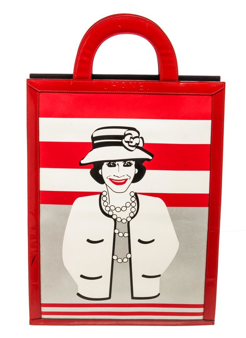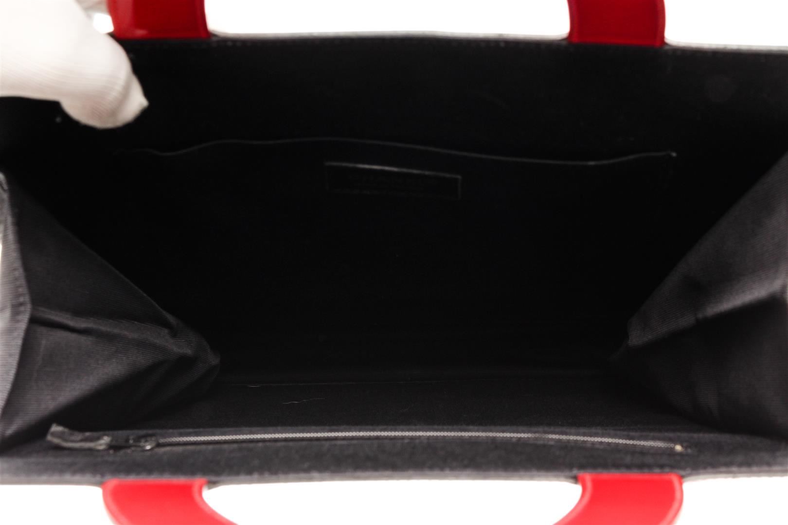 One Chanel Black Red Graphic Print Vintage Mademoiselle Tote Bag. Item is sold AS-IS. All available information is listed in the description and shown in the photo. Chanel Black Red Graphic Print Vintage Mademoiselle Tote Bag with patent leather trim, interior black canvas lining, interior slip and zip pockets, dual flat top handles, and open closure. Please note: scratches and material burn on bay of bag, please see photographs. .