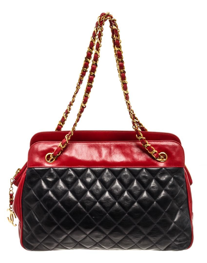 Chanel Black Red Lambskin Leather Matelasse Chain Shoulder Bag. All available information is listed in the description and shown in the photos. Chanel Black Red Lambskin Leather Matelasse Chain Shoulder Bag, gold-tone hardware, two open pockets at front, chain shoulder strap intertwined with red leather, zipper closure at top main compartment and red leather interior lining with one zipped pocket inside.
