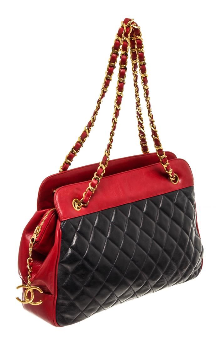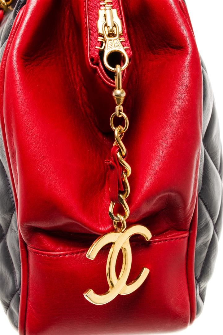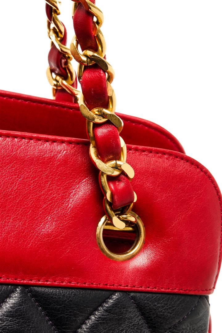 Chanel Black Red Lambskin Leather Matelasse Chain Shoulder Bag. All available information is listed in the description and shown in the photos. Chanel Black Red Lambskin Leather Matelasse Chain Shoulder Bag, gold-tone hardware, two open pockets at front, chain shoulder strap intertwined with red leather, zipper closure at top main compartment and red leather interior lining with one zipped pocket inside.