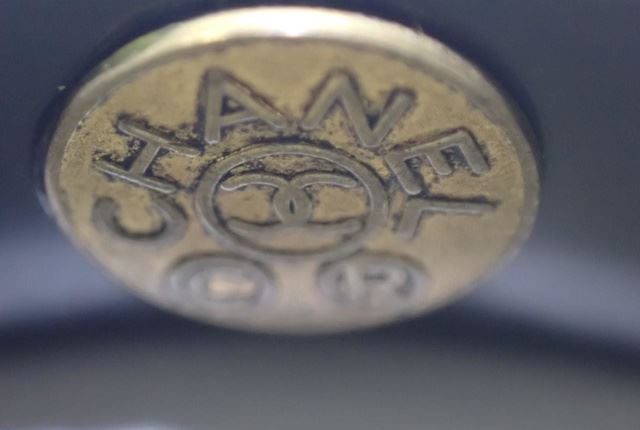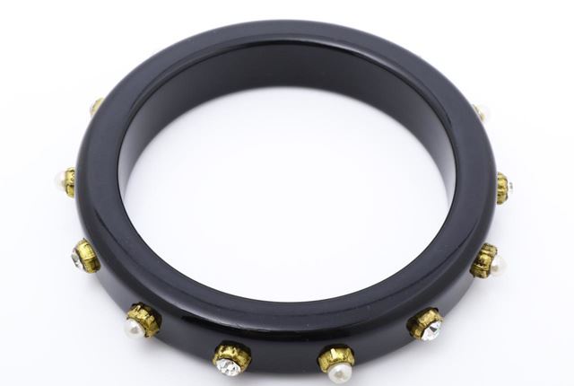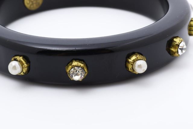 Black resin Chanel Bangle bracelet with gold-tone metal embellishments, clear rhinestones and white faux pearls.