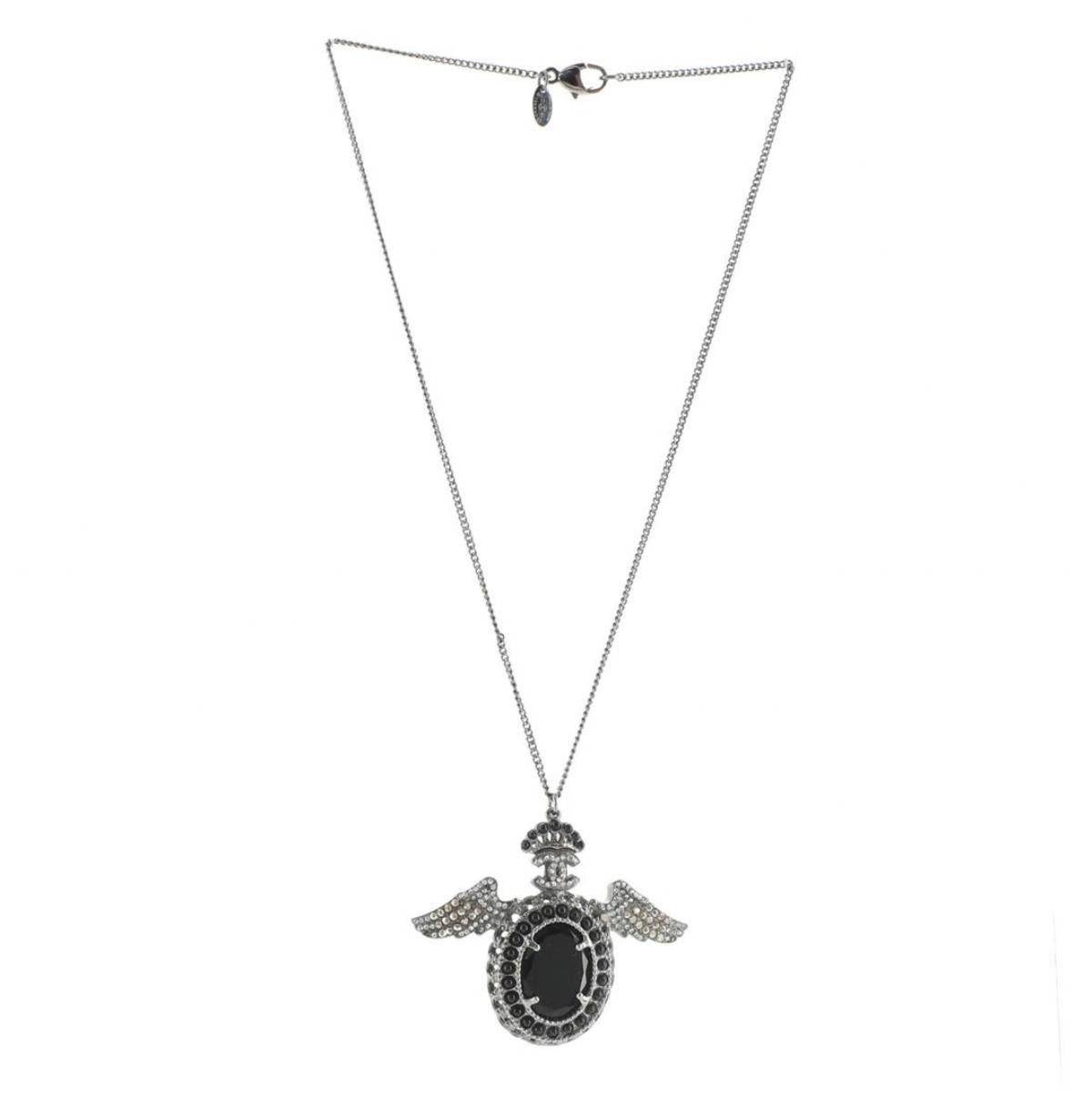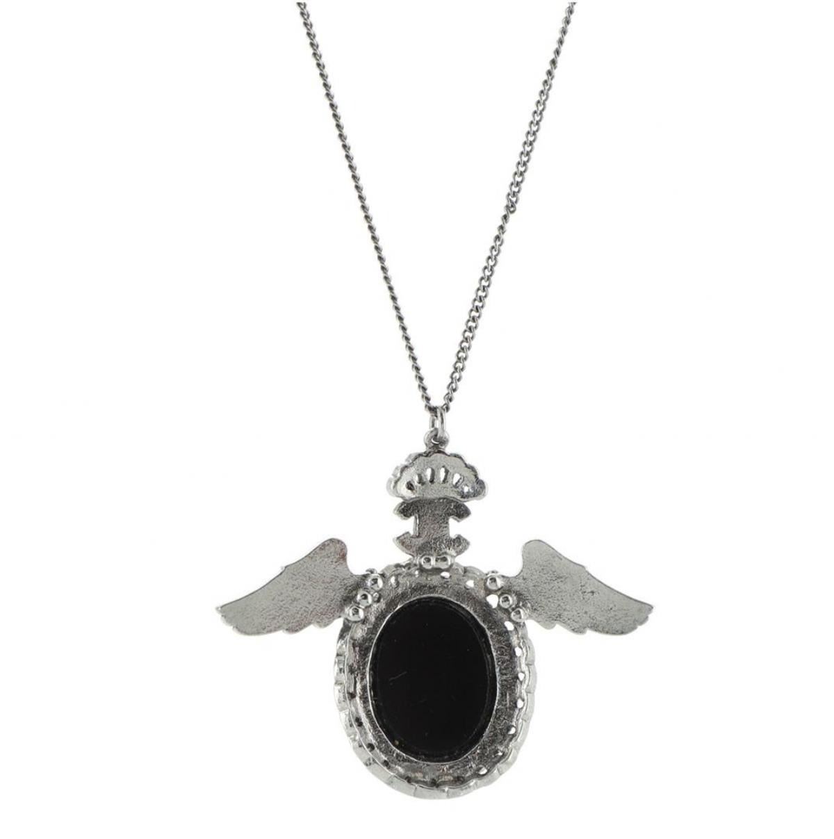 Chanel Oval Wing Metal and Rhinestone Pendant Necklace with cabochon Bead, silver-tone long chain, and lobster claw closure.
