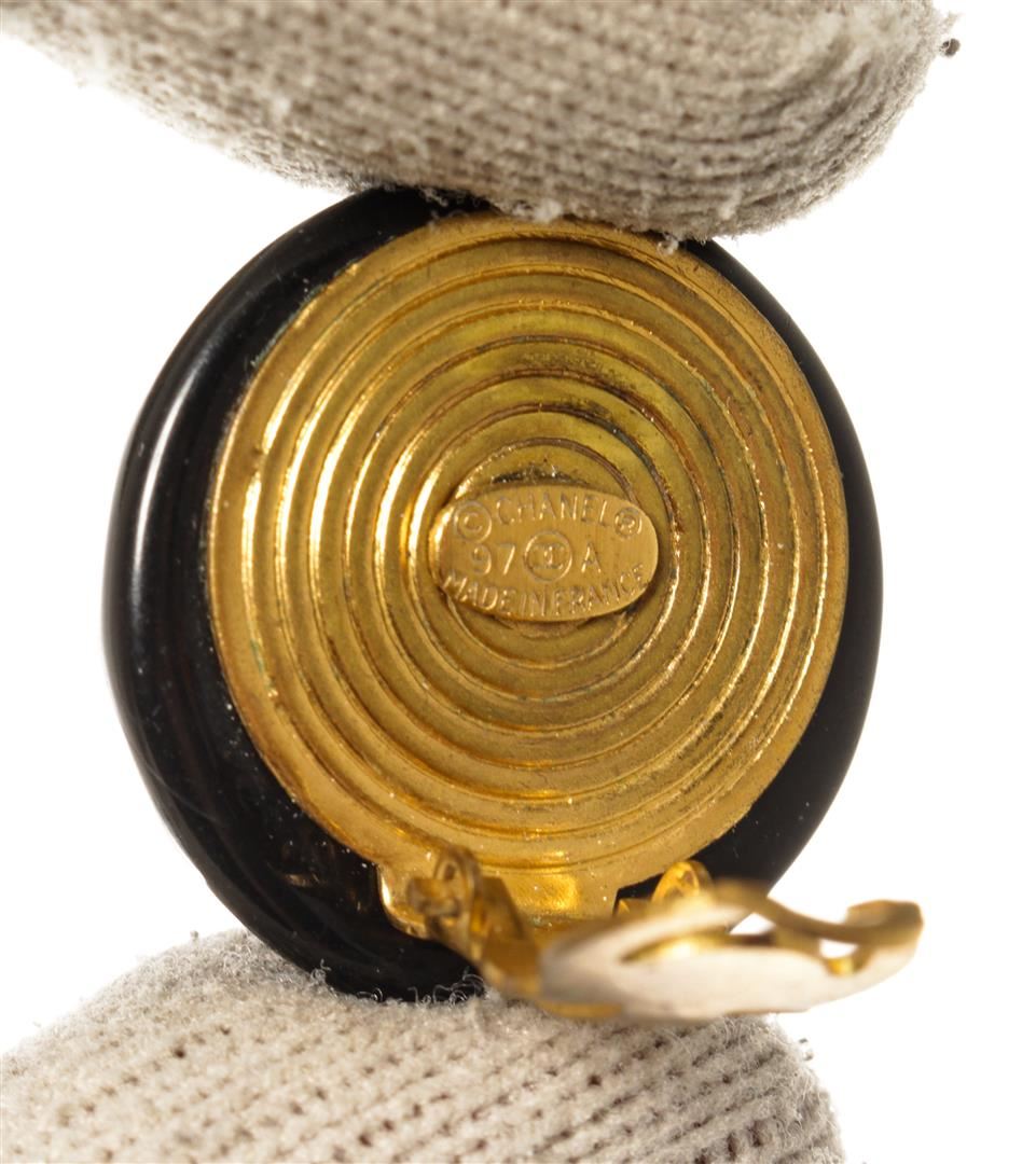 Chanel Black Round CC Earrings. All available information is listed in the description and shown in the photos. Chanel Black Round CC Earrings with gold tone metal hardware.