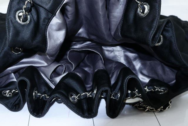 One Chanel Black Satin Melrose Cabas Large Tote Bag. Item is sold AS-IS. All available information is listed in the description and shown in the photo. Black satin Chanel Melrose Cabas tote with silver-tone hardware, quilted satin panel at base, dual chain-link and satin shoulder straps, grey satin interior lining, dual pockets at interior walls and drawstring closure at top. W: 58 cm (at widest) x H 35.5 cm x D: 5 cm